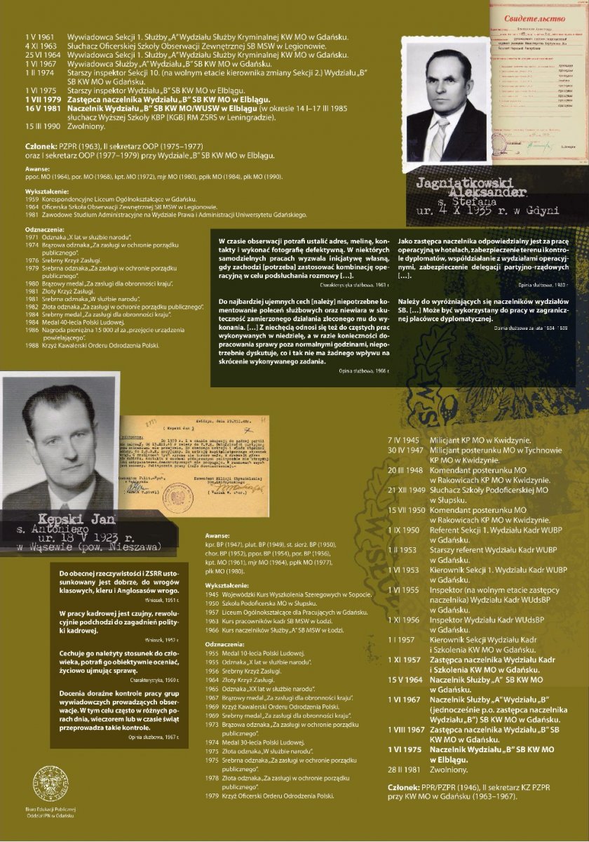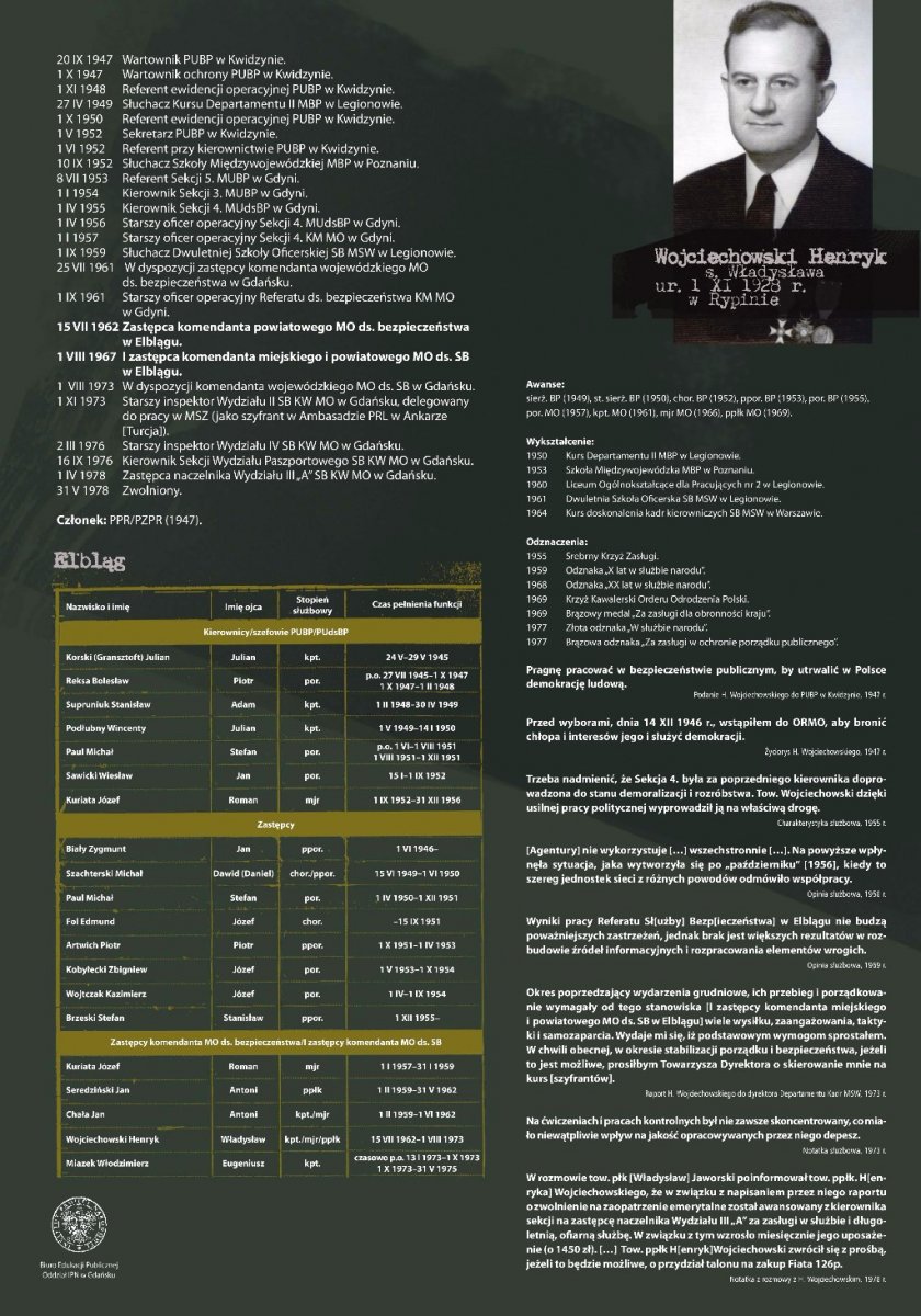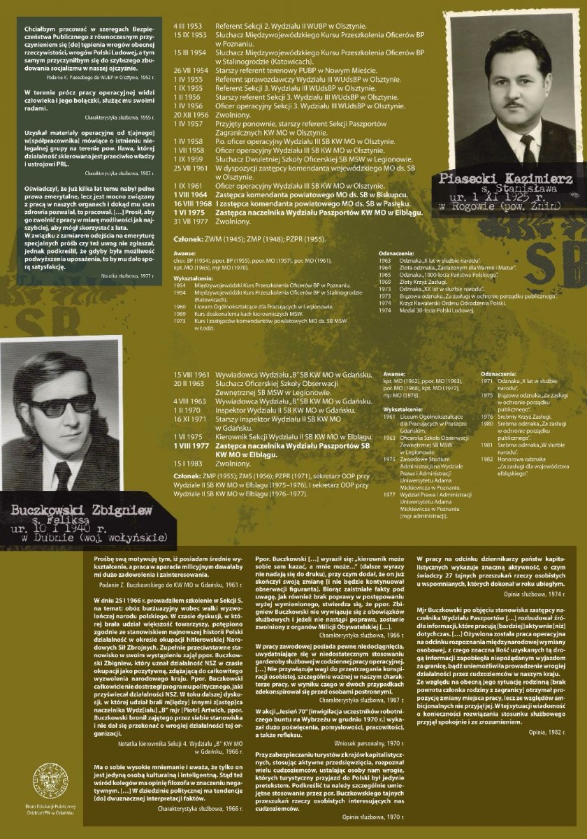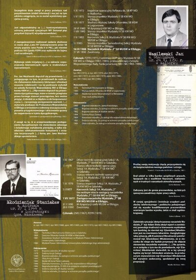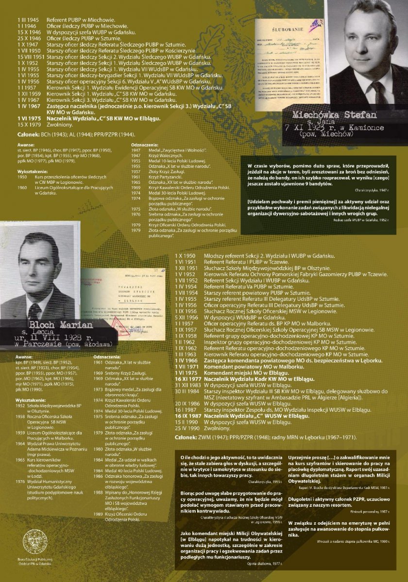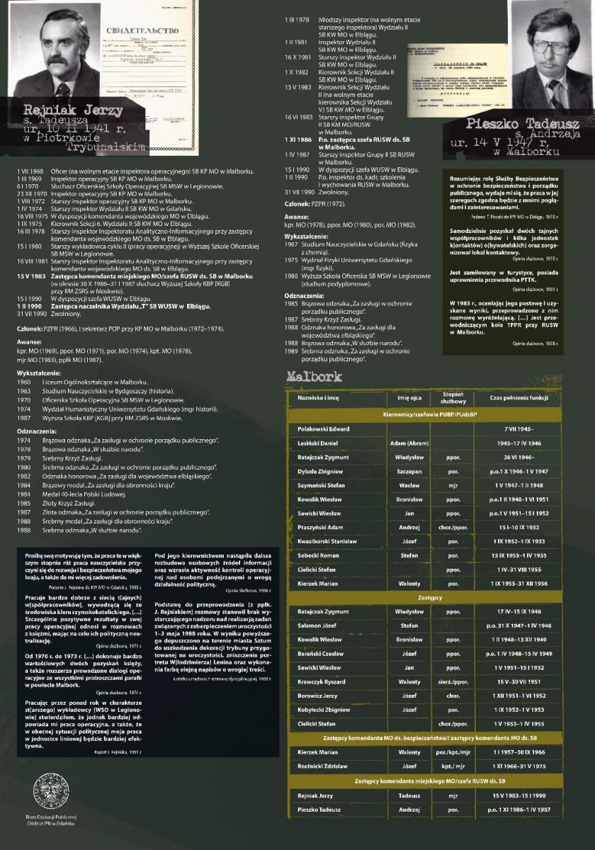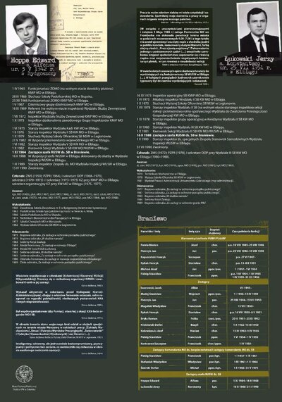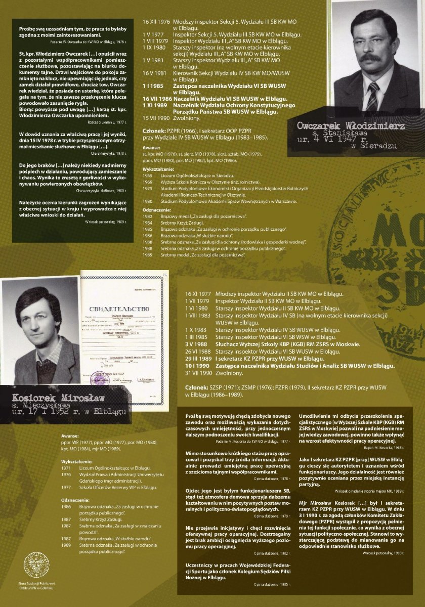 Ekspozycja zawiera zdjęcia i życiorysy najważniejszych przedstawicieli kadry kierowniczej SB województwa elbląskiego w latach 1975–1990. Szczegółowe biogramy sporządzono na podstawie akt personalnych funkcjonariuszy SB ze zbiorów archiwów IPN oraz przechowywanych w tych archiwach rozkazów personalnych i awansowych. Wystawa przed-stawia także struktury powiatowe bezpieki.