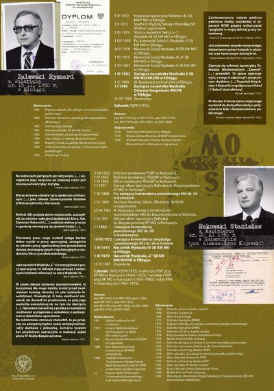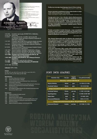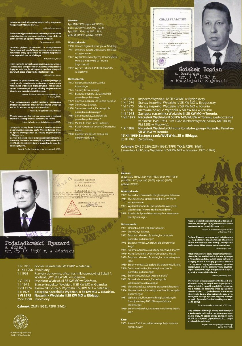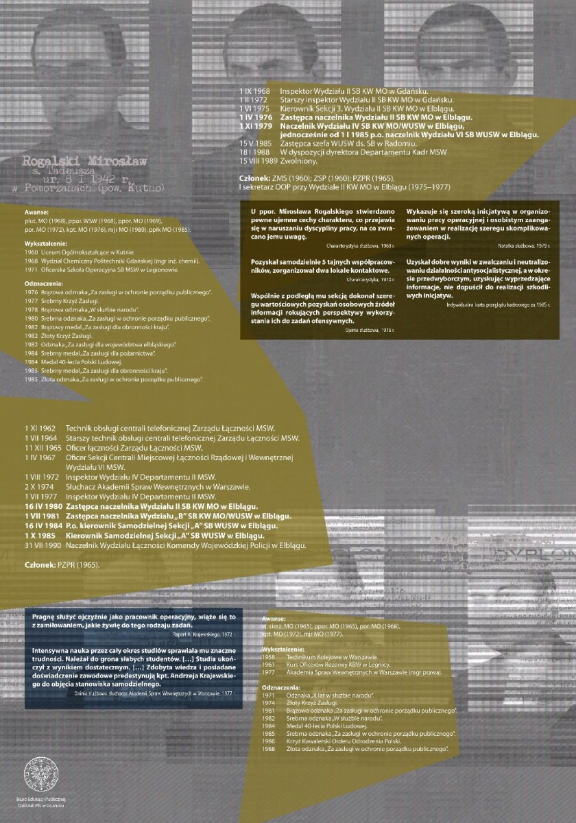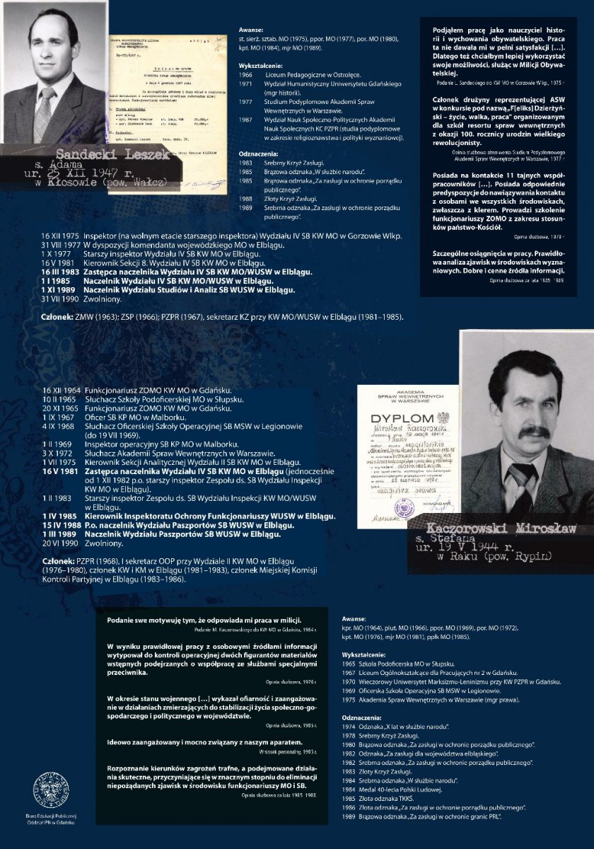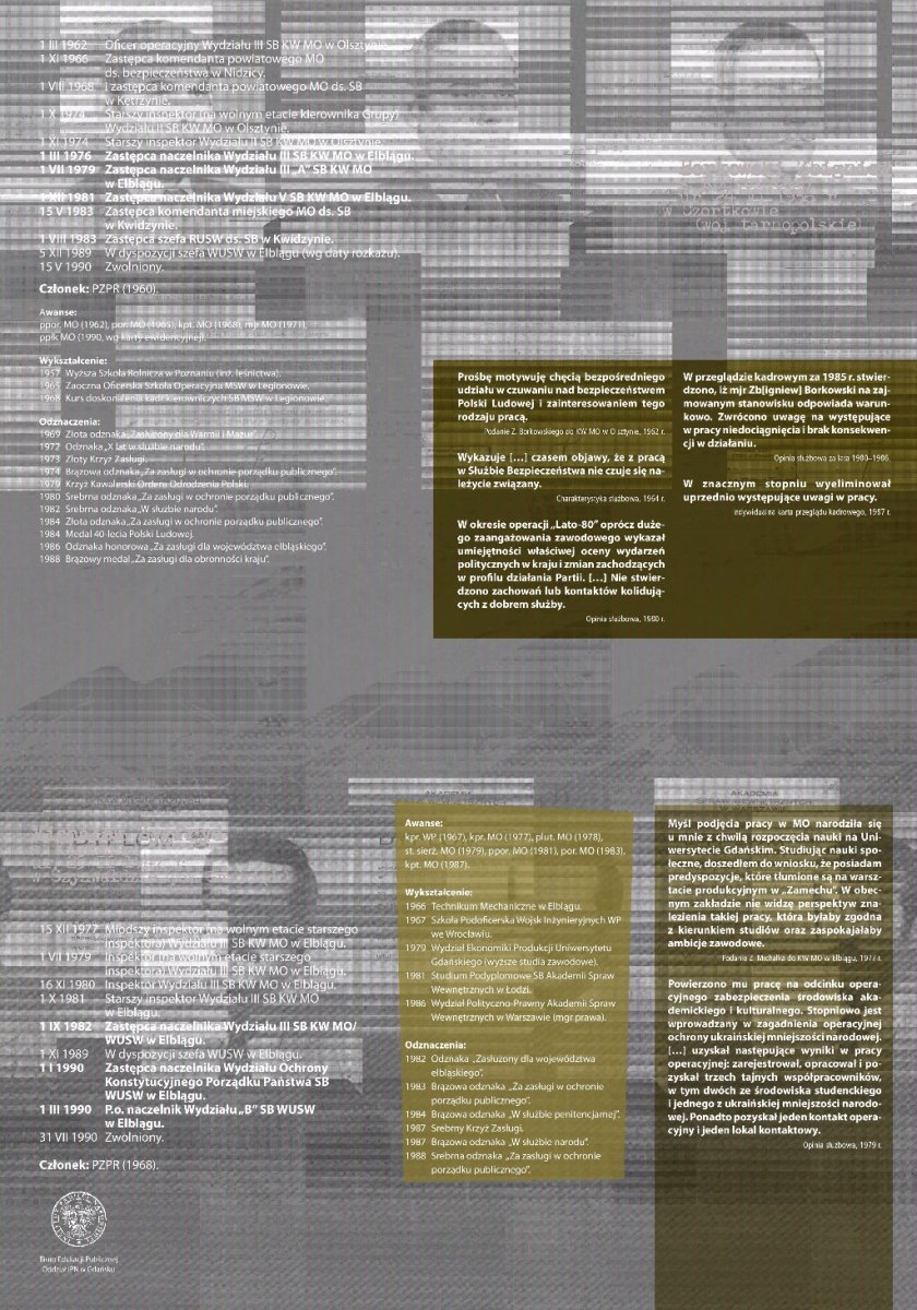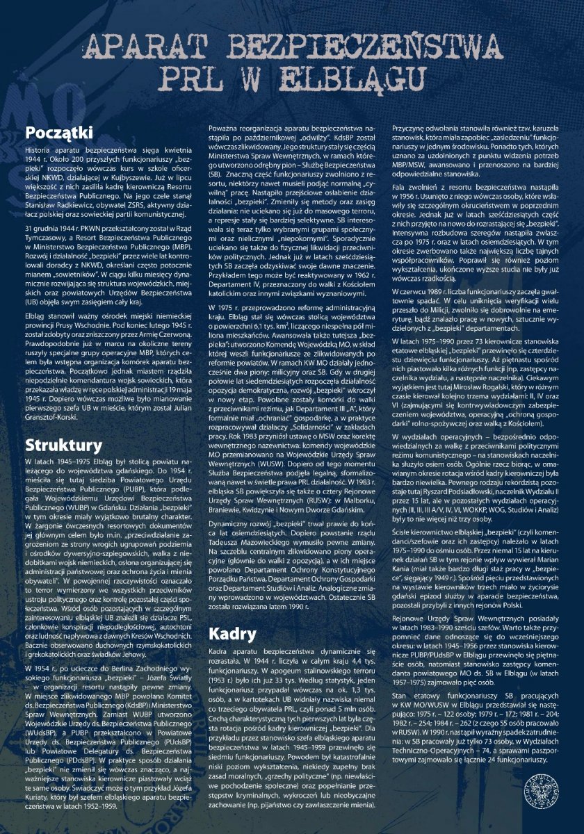 Ekspozycja zawiera zdjęcia i życiorysy najważniejszych przedstawicieli kadry kierowniczej SB województwa elbląskiego w latach 1975–1990. Szczegółowe biogramy sporządzono na podstawie akt personalnych funkcjonariuszy SB ze zbiorów archiwów IPN oraz przechowywanych w tych archiwach rozkazów personalnych i awansowych. Wystawa przed-stawia także struktury powiatowe bezpieki.