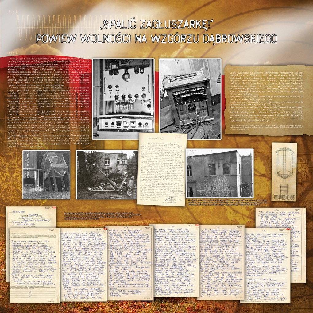 W wyniku wydarzeń, rozgrywających się na ulicach Bydgoszczy (awantura przed jednym z kin, interwencja MO, starcia tłumu z milicjantami, a następnie sformowanie pochodu, wznoszącego patriotyczne okrzyki, wyrażającego swoje poparcie m.in. dla Węgrów i poznańskich robotników), tłum manifestantów wtargnął na teren Komendy Wojewódzkiej MO, a następnie skierował się do stacji zagłuszającej (tzw. zagłuszarki), znajdującej się na Wzgórzu Dąbrowskiego w bydgoskim Szwederowie, i zniszczył znajdujące się tam urządzenia.