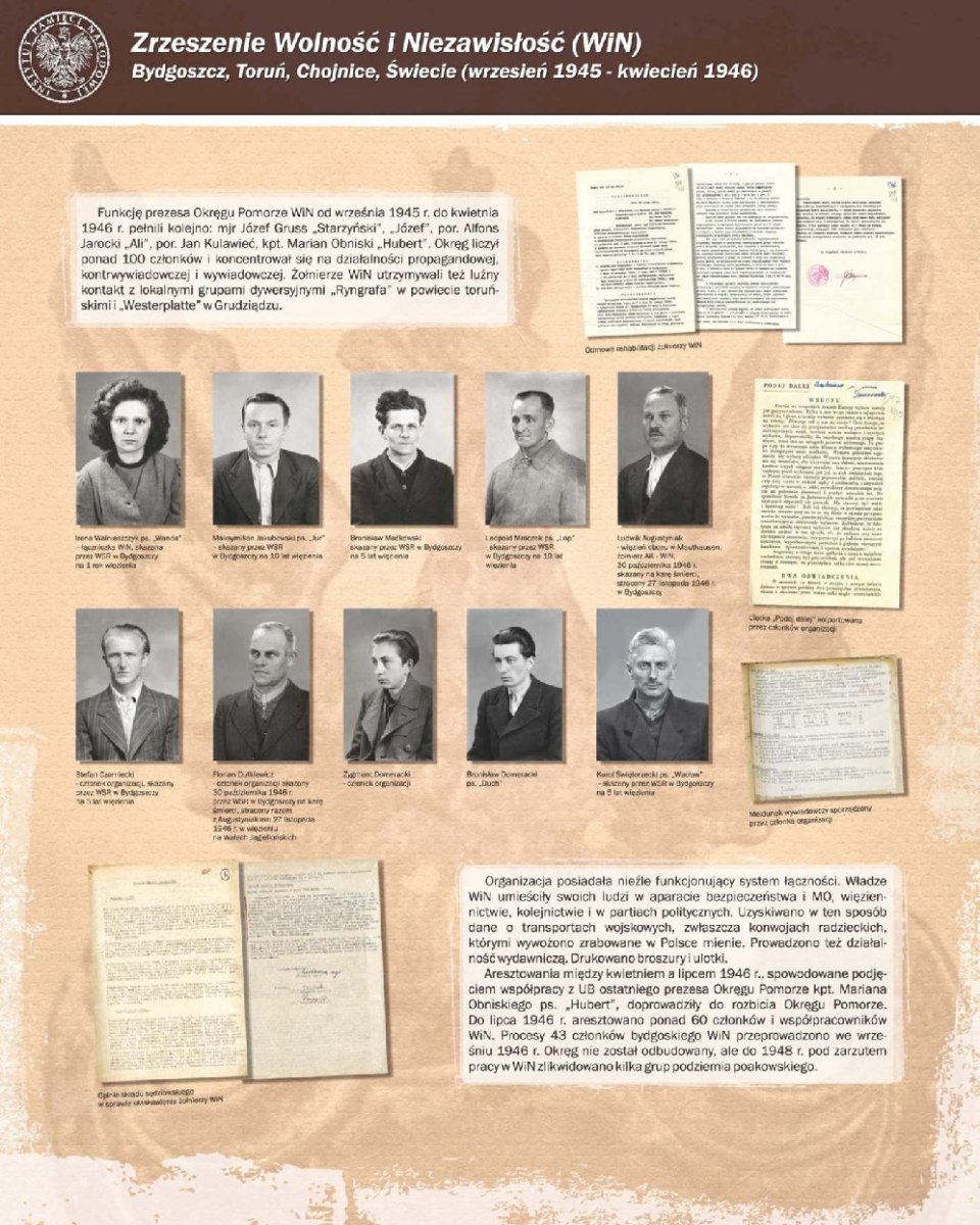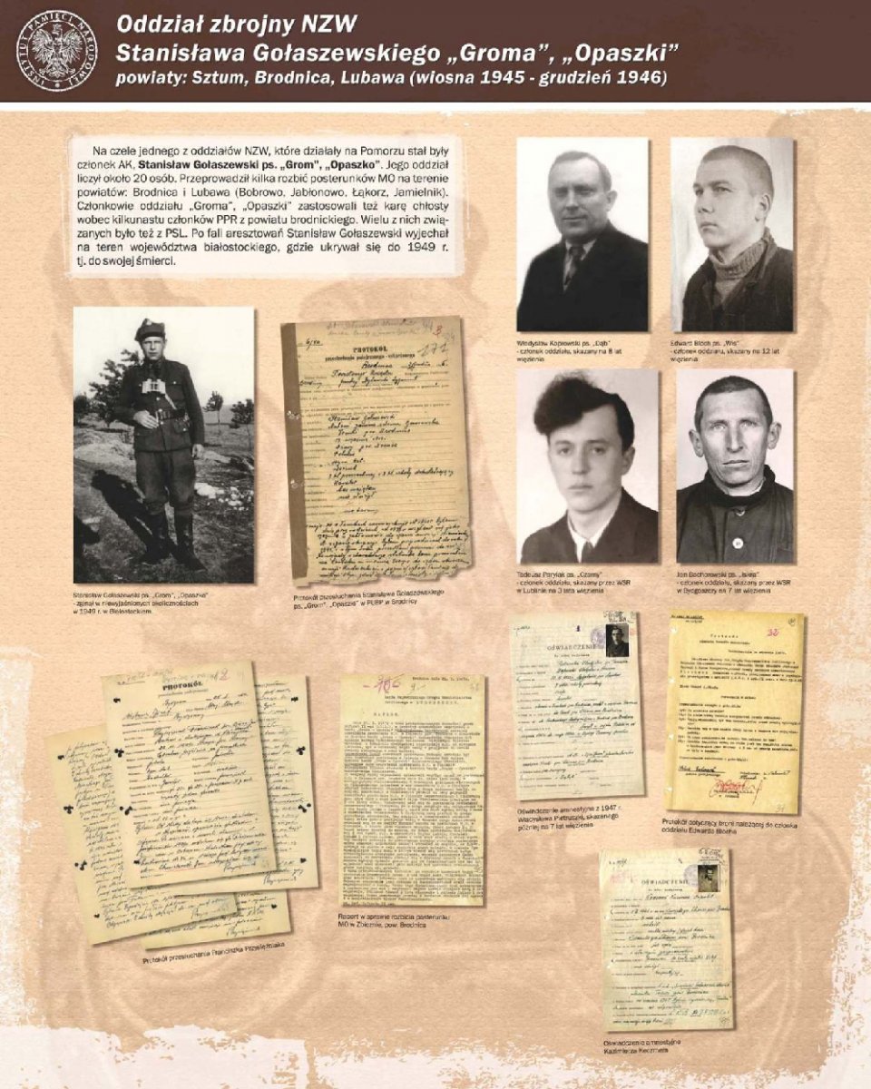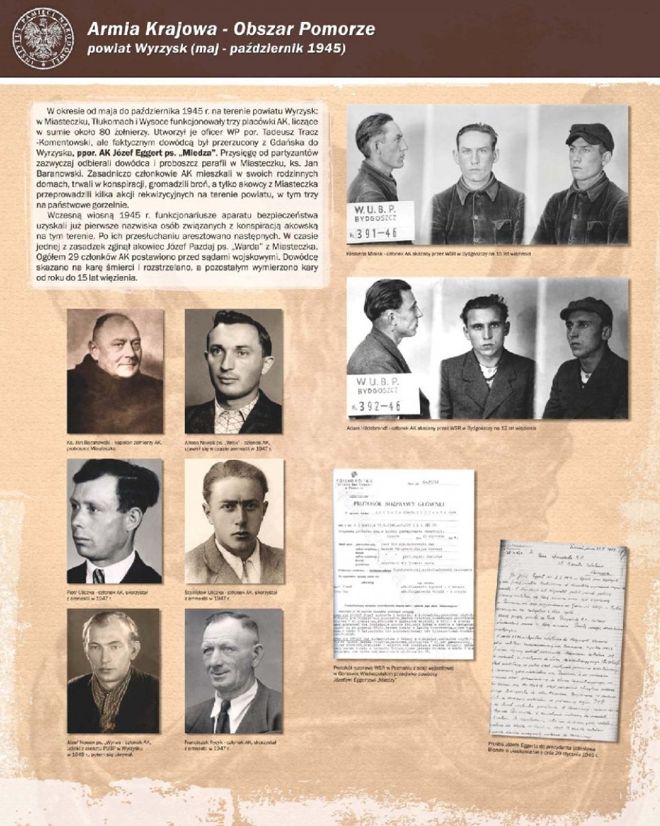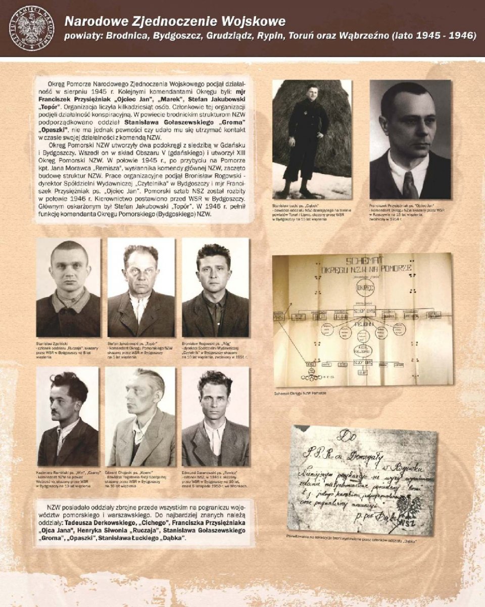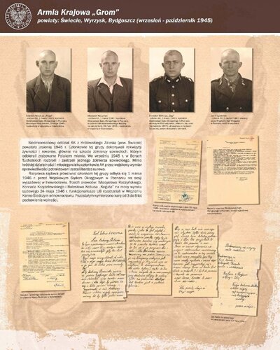 Zaprezentowano 90 dokumentów oraz około 180 zdjęć portretowych członków Pomorskiego Okręgu Armii Krajowej, Zrzeszenia Wolność i Niezawisłość, Ruchu Oporu Armii Krajowej, Narodowych Sił Zbrojnych oraz żołnierzy lokalnych oddziałów zbrojnych, m.in.: Leona Mullera „Jędrusia", Jerzego Gadzinowskiego „Szarego", Antoniego Fryszkowskiego „Rysia", Stanisława Kamińskiego „Młota".