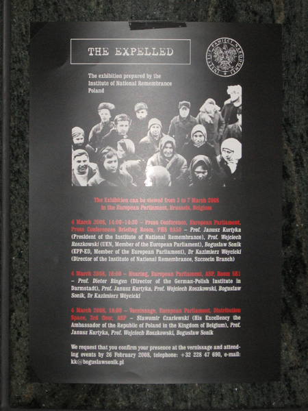 W dniach 3–7 marca 2008 r. w Parlamencie Europejskim w Brukseli prezentowana była wystawa „The Expelled” („Wygnańcy”), przygotowana przez Biuro Edukacji Publicznej Instytutu Pamięci Narodowej.