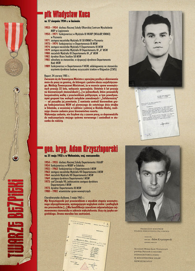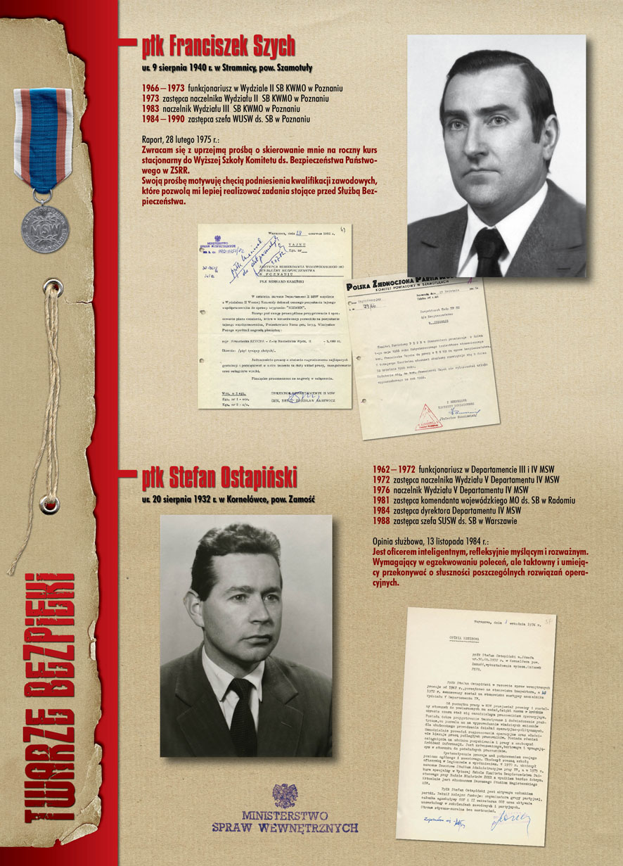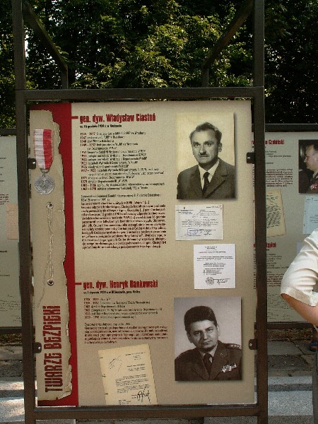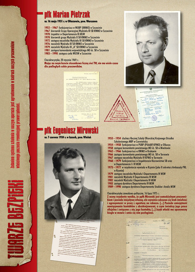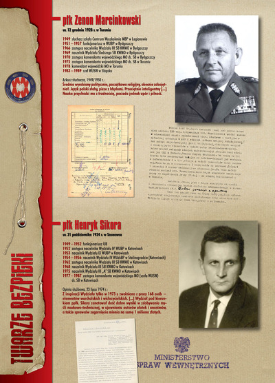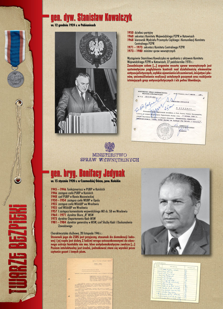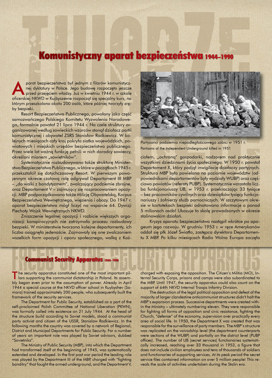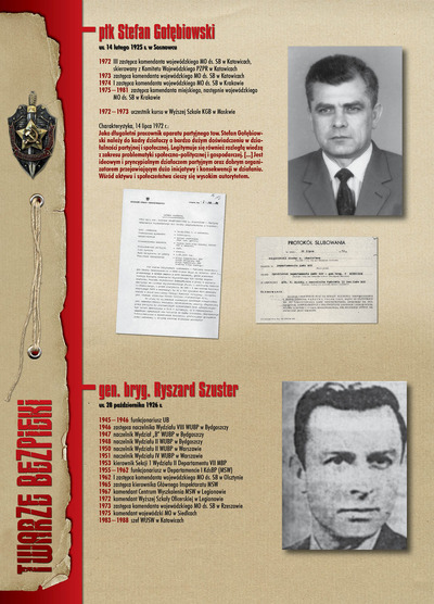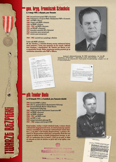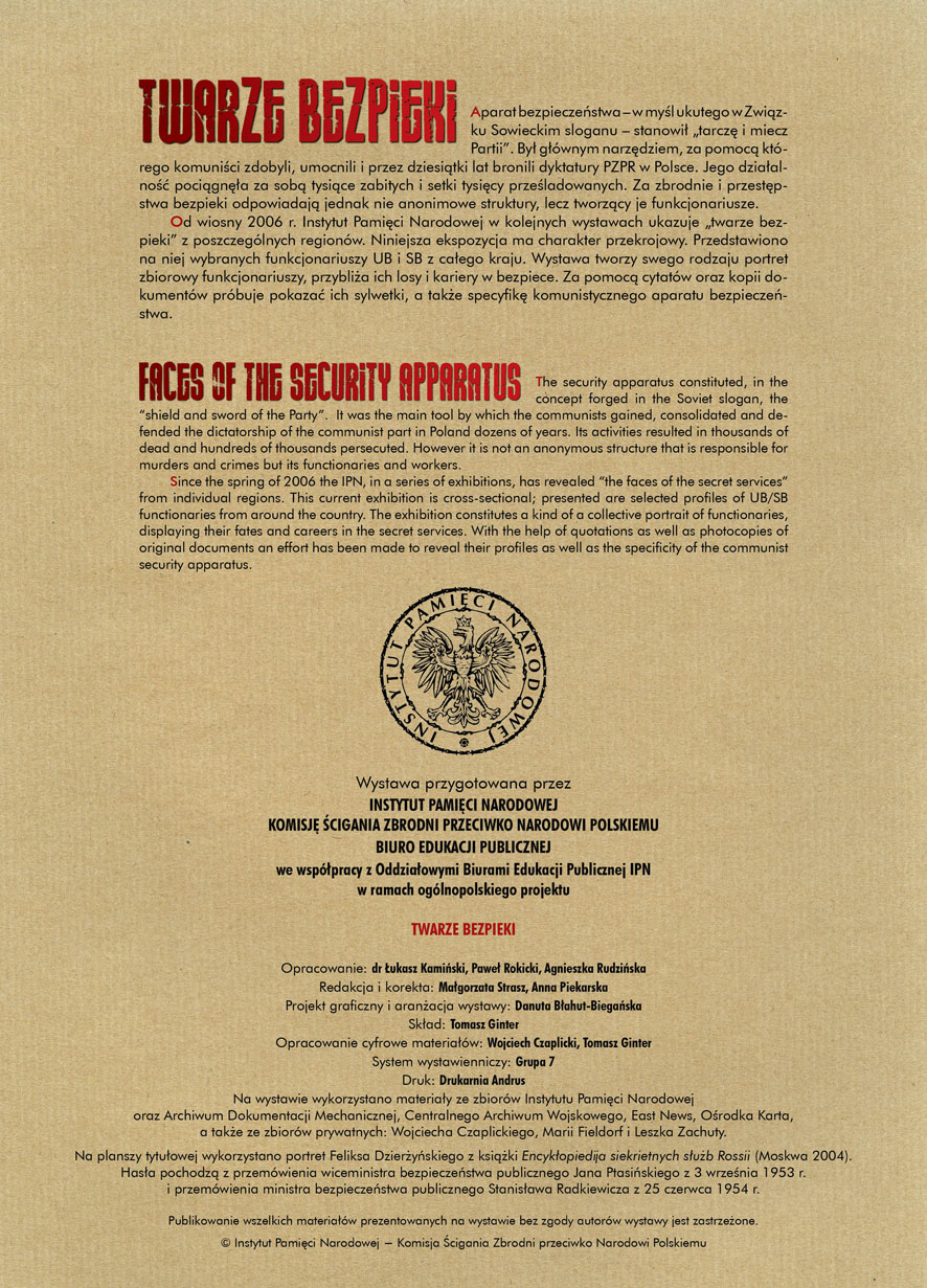W dniu 22 lipca 2007 roku prezes IPN Janusz Kurtyka otworzył w Alejach Ujazdowskich (vis ả vis gmachu Ministerstwa Sprawiedliwości) plenerową wystawę „Twarze Bezpieki 1944–1990”. *** Aparat bezpieczeństwa stanowił, w myśl ukutego w Związku Sowieckim sloganu, „tarczę i miecz Partii”. Był on głównym narzędziem, przy pomocy którego komuniści zdobyli, umocnili i przez dziesiątki lat bronili dyktatury PZPR w Polsce. Jego działalność pociągnęła za sobą tysiące zabitych i setki tysięcy prześladowanych. Za zbrodnie i przestępstwa bezpieki odpowiadają jednak nie anonimowe struktury, lecz tworzący je funkcjonariusze.