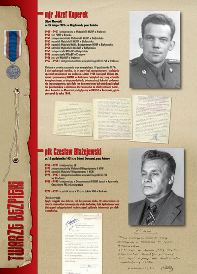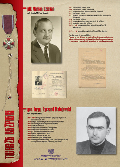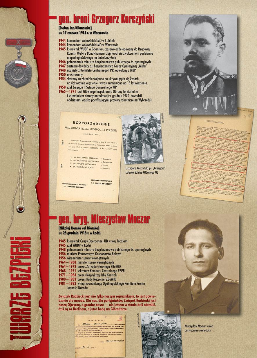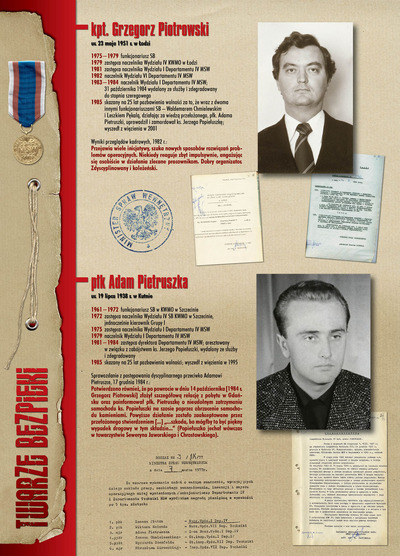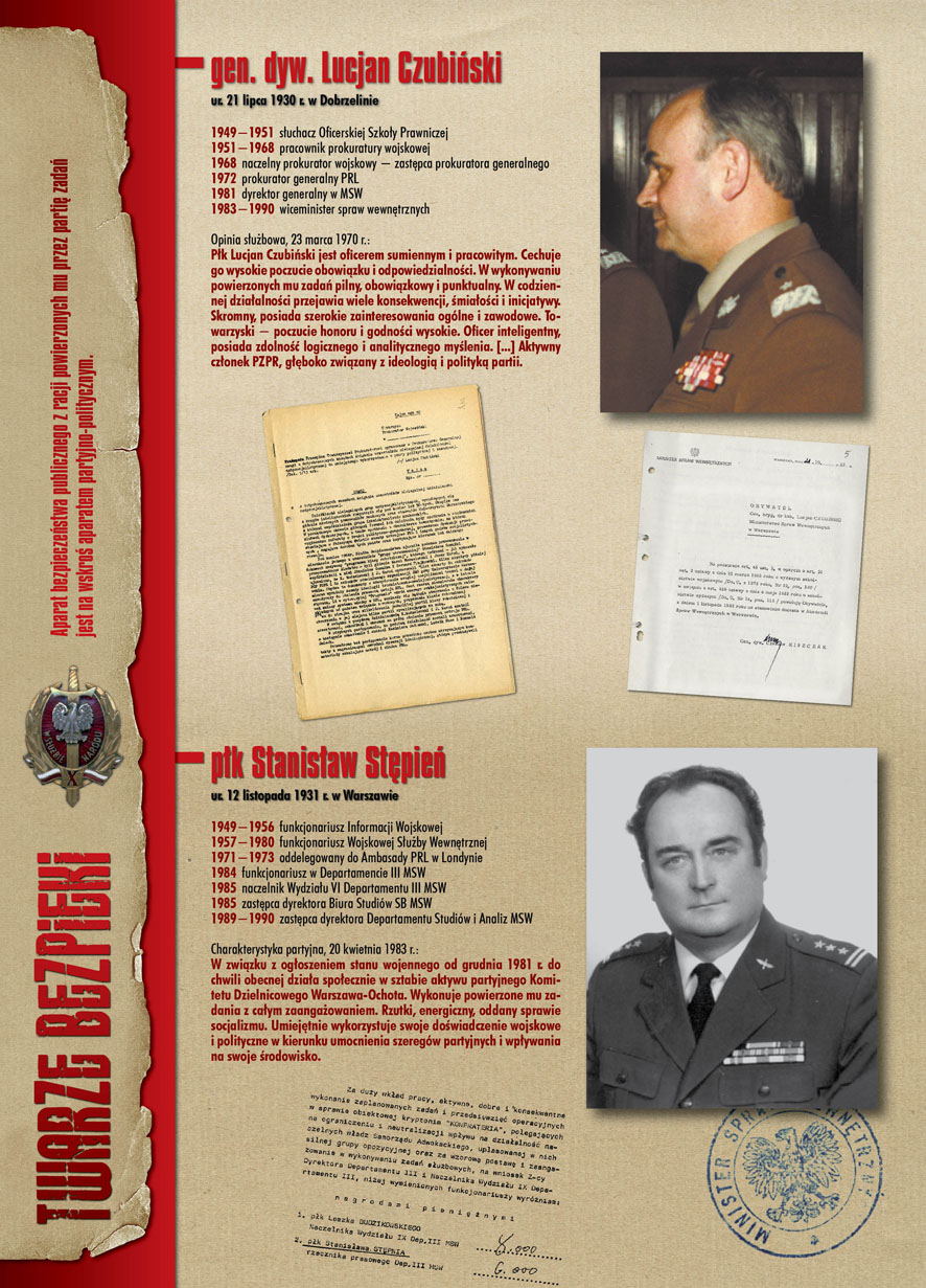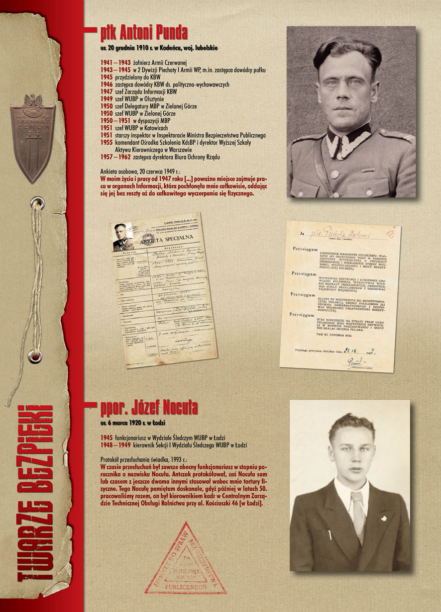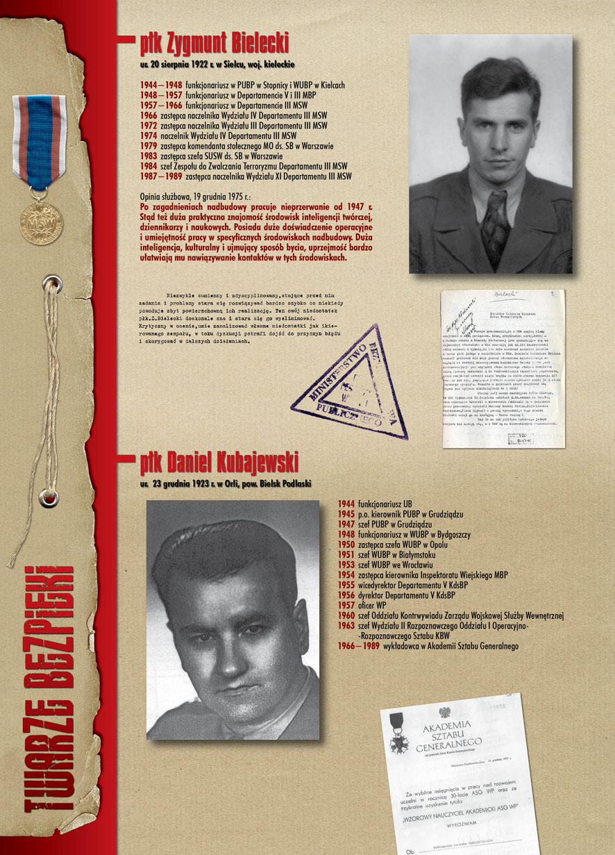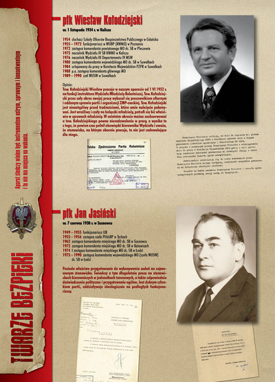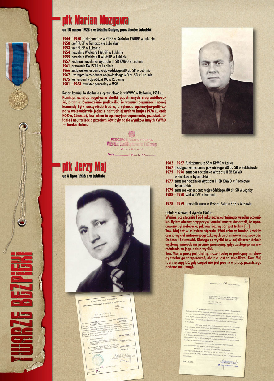 W dniu 22 lipca 2007 roku prezes IPN Janusz Kurtyka otworzył w Alejach Ujazdowskich (vis ả vis gmachu Ministerstwa Sprawiedliwości) plenerową wystawę „Twarze Bezpieki 1944–1990”. *** Aparat bezpieczeństwa stanowił, w myśl ukutego w Związku Sowieckim sloganu, „tarczę i miecz Partii”. Był on głównym narzędziem, przy pomocy którego komuniści zdobyli, umocnili i przez dziesiątki lat bronili dyktatury PZPR w Polsce. Jego działalność pociągnęła za sobą tysiące zabitych i setki tysięcy prześladowanych. Za zbrodnie i przestępstwa bezpieki odpowiadają jednak nie anonimowe struktury, lecz tworzący je funkcjonariusze.