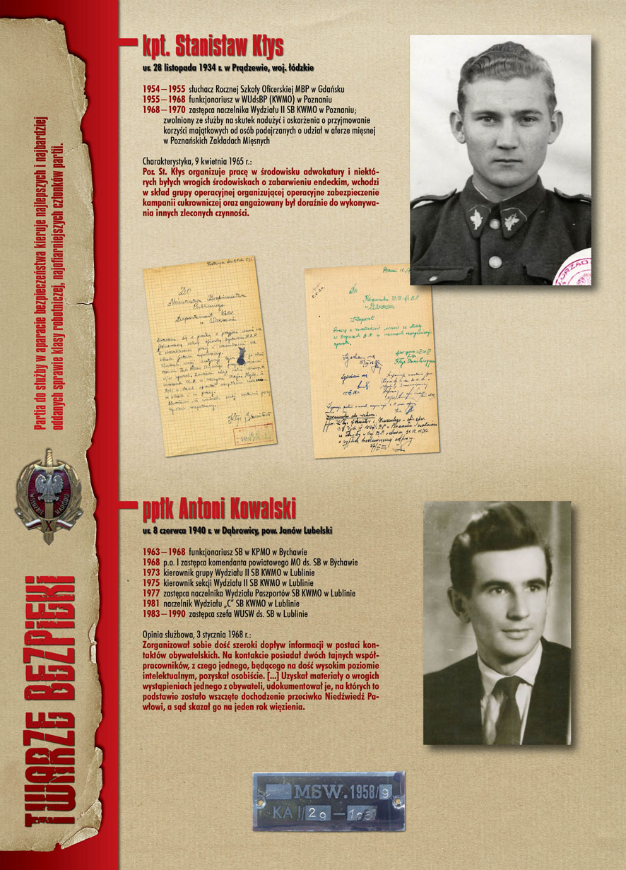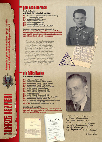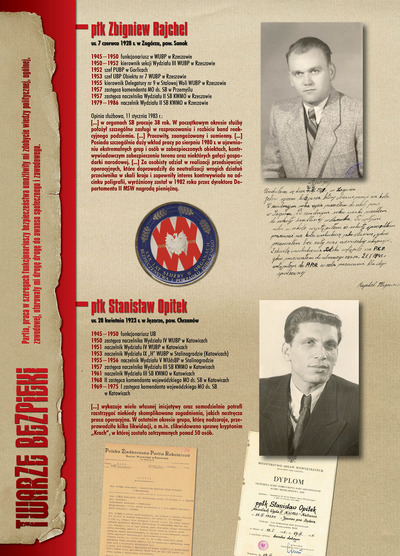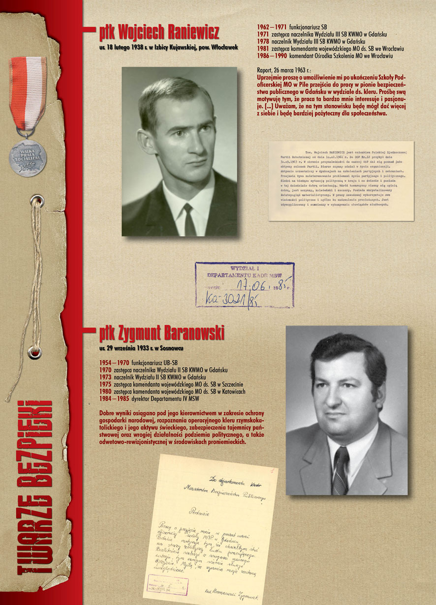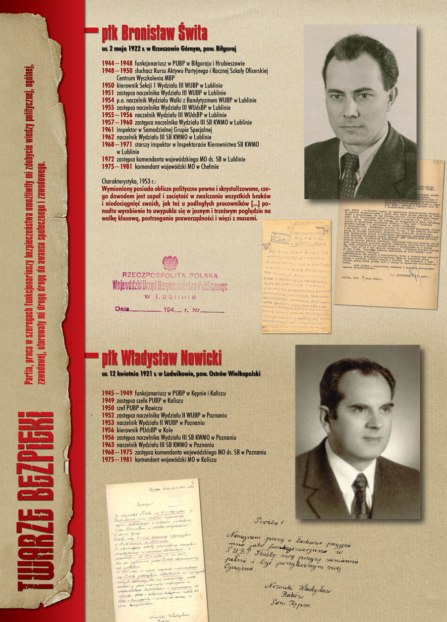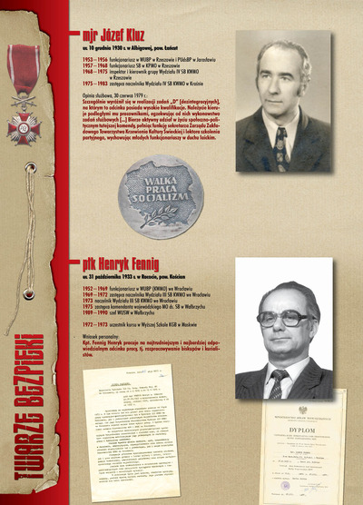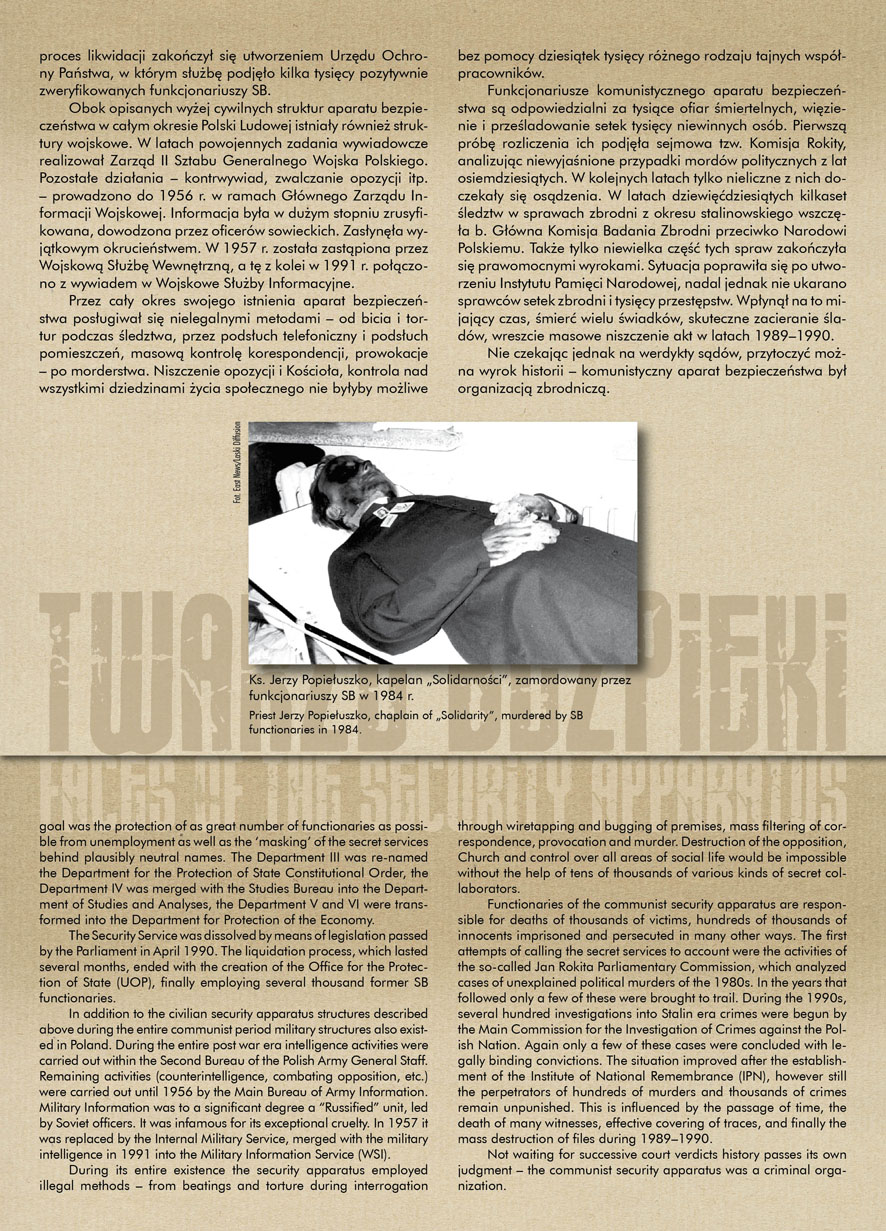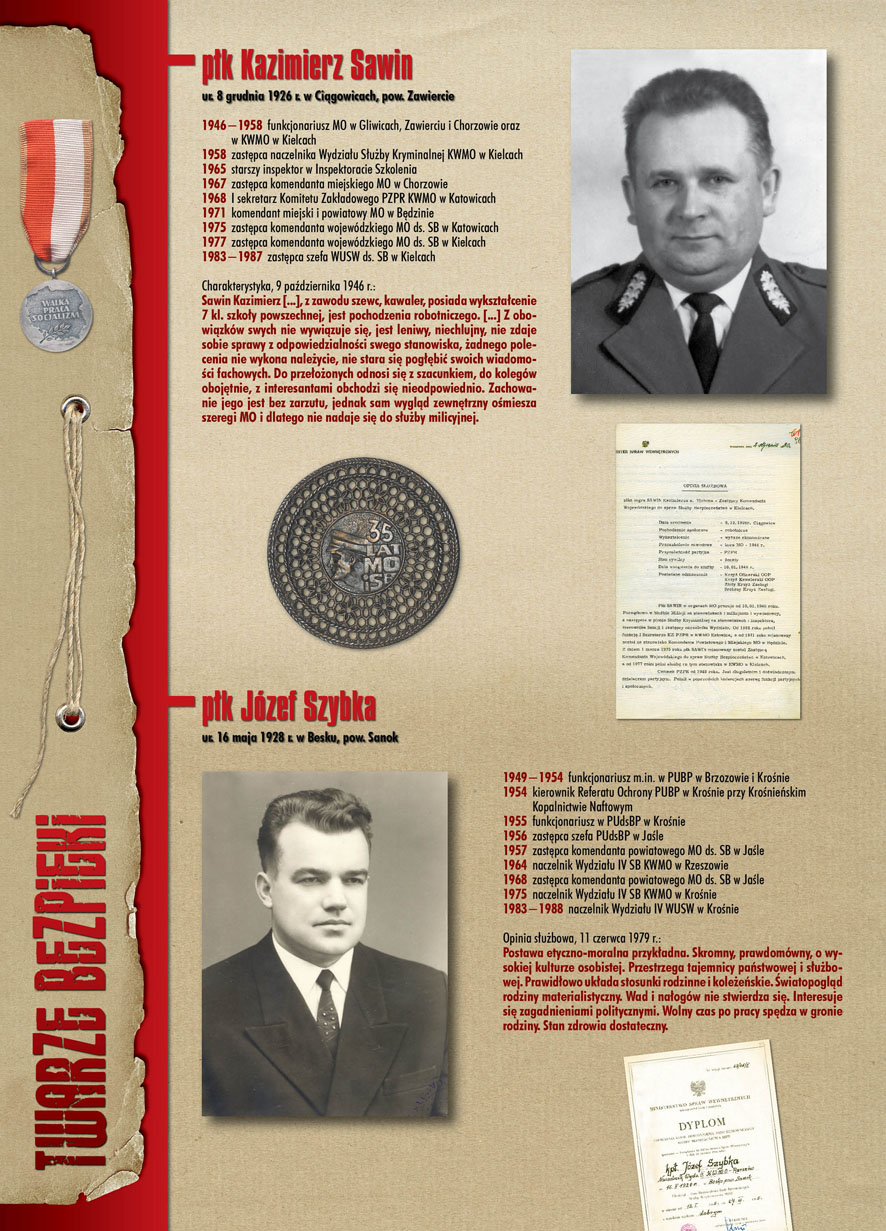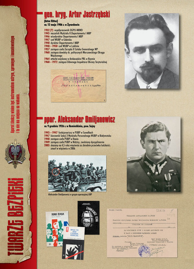 W dniu 22 lipca 2007 roku prezes IPN Janusz Kurtyka otworzył w Alejach Ujazdowskich (vis ả vis gmachu Ministerstwa Sprawiedliwości) plenerową wystawę „Twarze Bezpieki 1944–1990”. *** Aparat bezpieczeństwa stanowił, w myśl ukutego w Związku Sowieckim sloganu, „tarczę i miecz Partii”. Był on głównym narzędziem, przy pomocy którego komuniści zdobyli, umocnili i przez dziesiątki lat bronili dyktatury PZPR w Polsce. Jego działalność pociągnęła za sobą tysiące zabitych i setki tysięcy prześladowanych. Za zbrodnie i przestępstwa bezpieki odpowiadają jednak nie anonimowe struktury, lecz tworzący je funkcjonariusze.