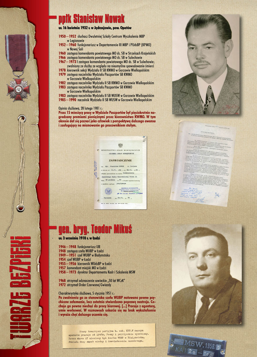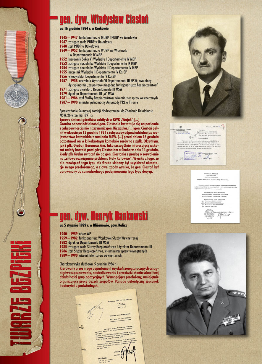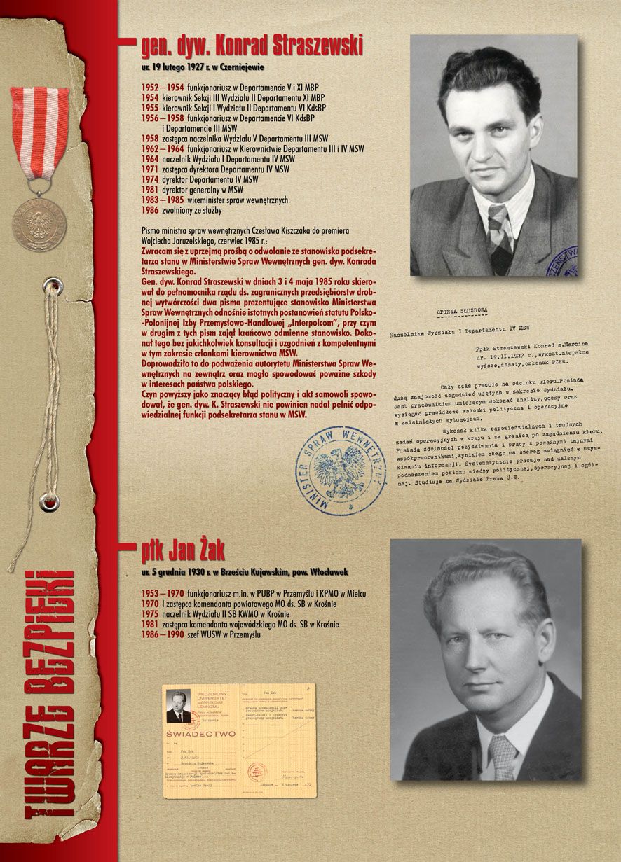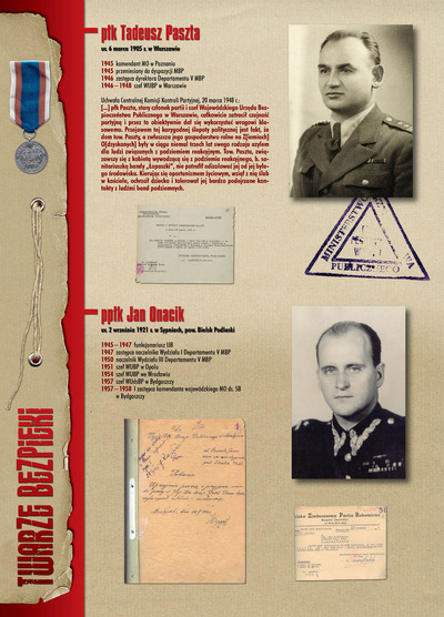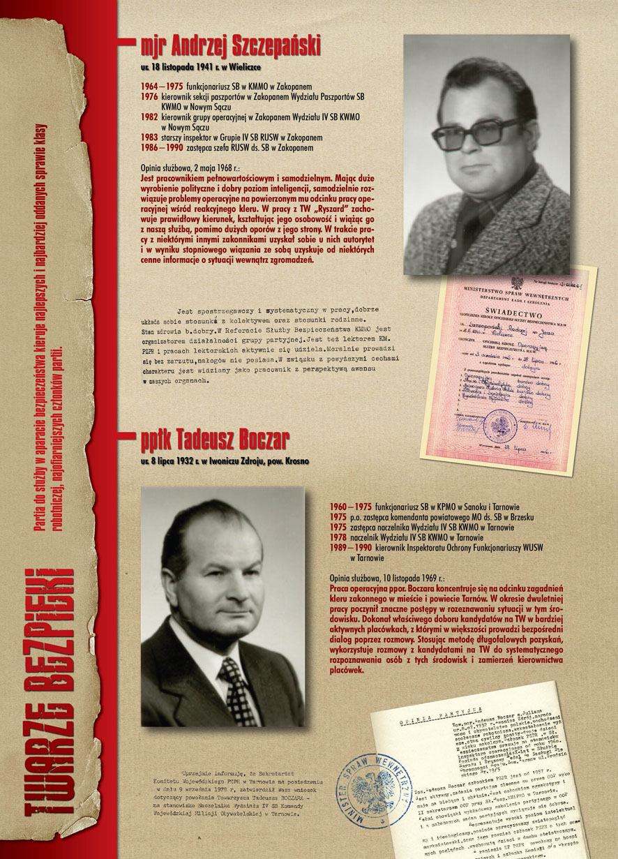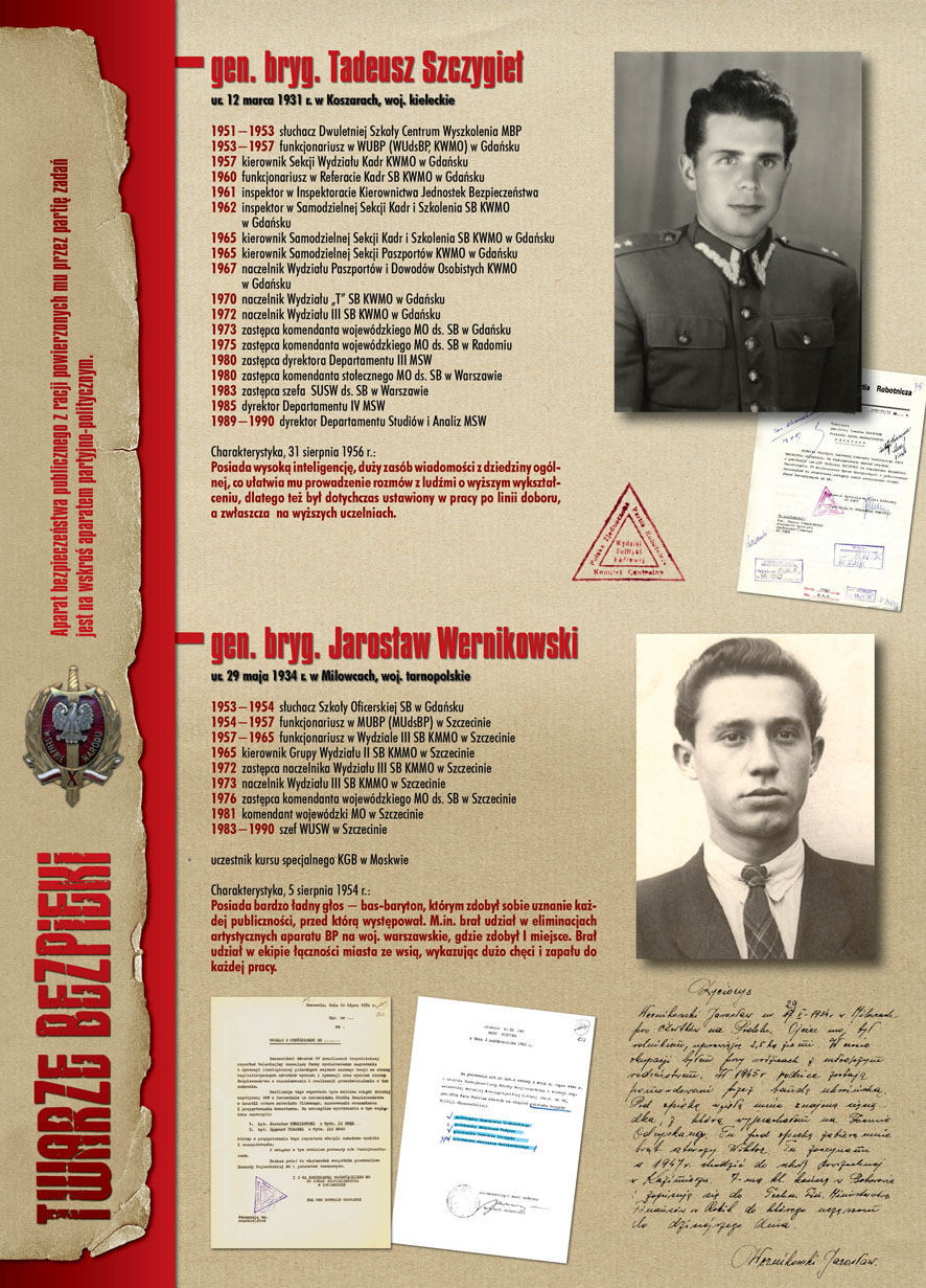 W dniu 22 lipca 2007 roku prezes IPN Janusz Kurtyka otworzył w Alejach Ujazdowskich (vis ả vis gmachu Ministerstwa Sprawiedliwości) plenerową wystawę „Twarze Bezpieki 1944–1990”. *** Aparat bezpieczeństwa stanowił, w myśl ukutego w Związku Sowieckim sloganu, „tarczę i miecz Partii”. Był on głównym narzędziem, przy pomocy którego komuniści zdobyli, umocnili i przez dziesiątki lat bronili dyktatury PZPR w Polsce. Jego działalność pociągnęła za sobą tysiące zabitych i setki tysięcy prześladowanych. Za zbrodnie i przestępstwa bezpieki odpowiadają jednak nie anonimowe struktury, lecz tworzący je funkcjonariusze.