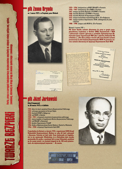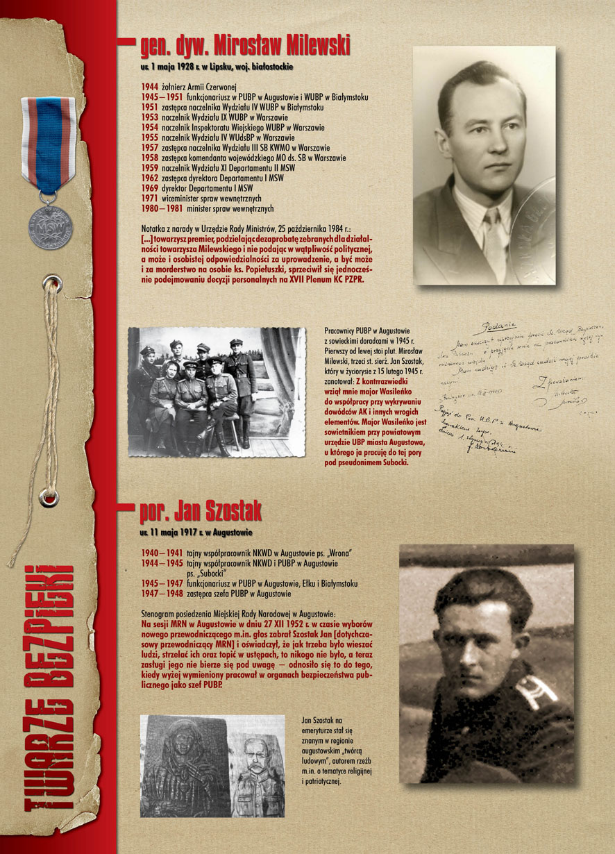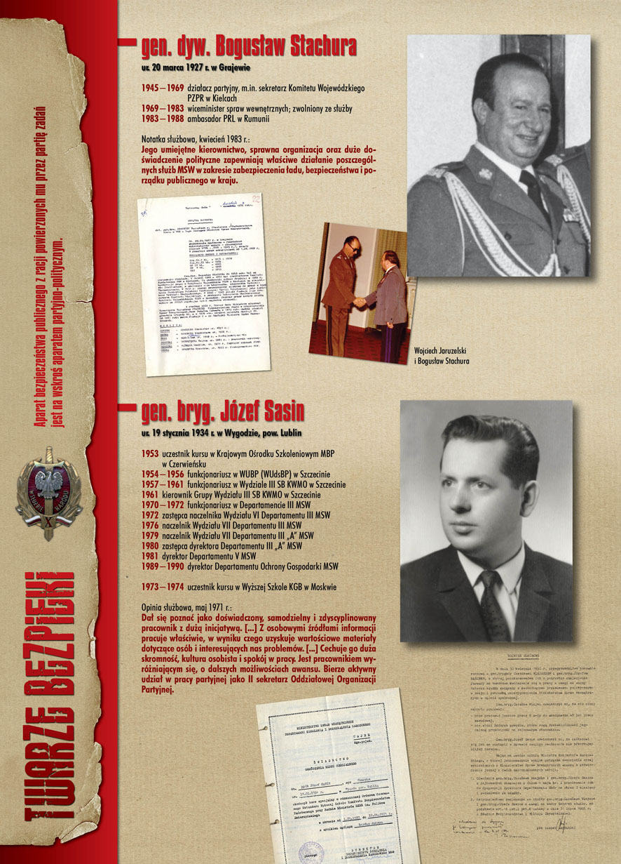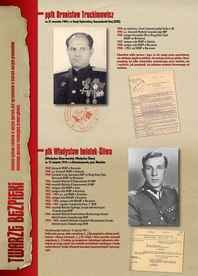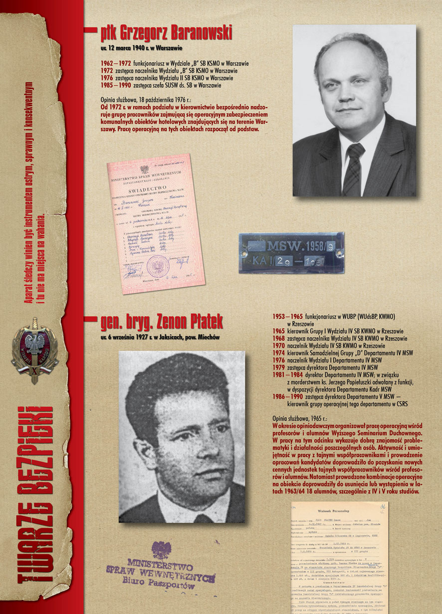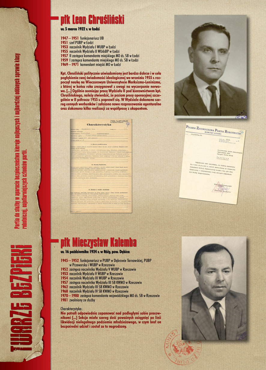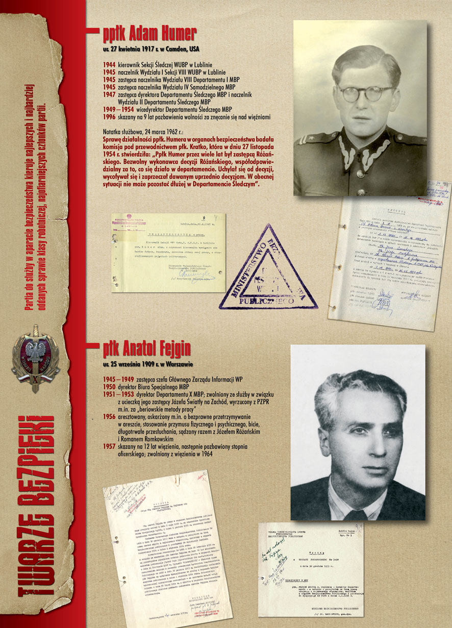 W dniu 22 lipca 2007 roku prezes IPN Janusz Kurtyka otworzył w Alejach Ujazdowskich (vis ả vis gmachu Ministerstwa Sprawiedliwości) plenerową wystawę „Twarze Bezpieki 1944–1990”. *** Aparat bezpieczeństwa stanowił, w myśl ukutego w Związku Sowieckim sloganu, „tarczę i miecz Partii”. Był on głównym narzędziem, przy pomocy którego komuniści zdobyli, umocnili i przez dziesiątki lat bronili dyktatury PZPR w Polsce. Jego działalność pociągnęła za sobą tysiące zabitych i setki tysięcy prześladowanych. Za zbrodnie i przestępstwa bezpieki odpowiadają jednak nie anonimowe struktury, lecz tworzący je funkcjonariusze.
