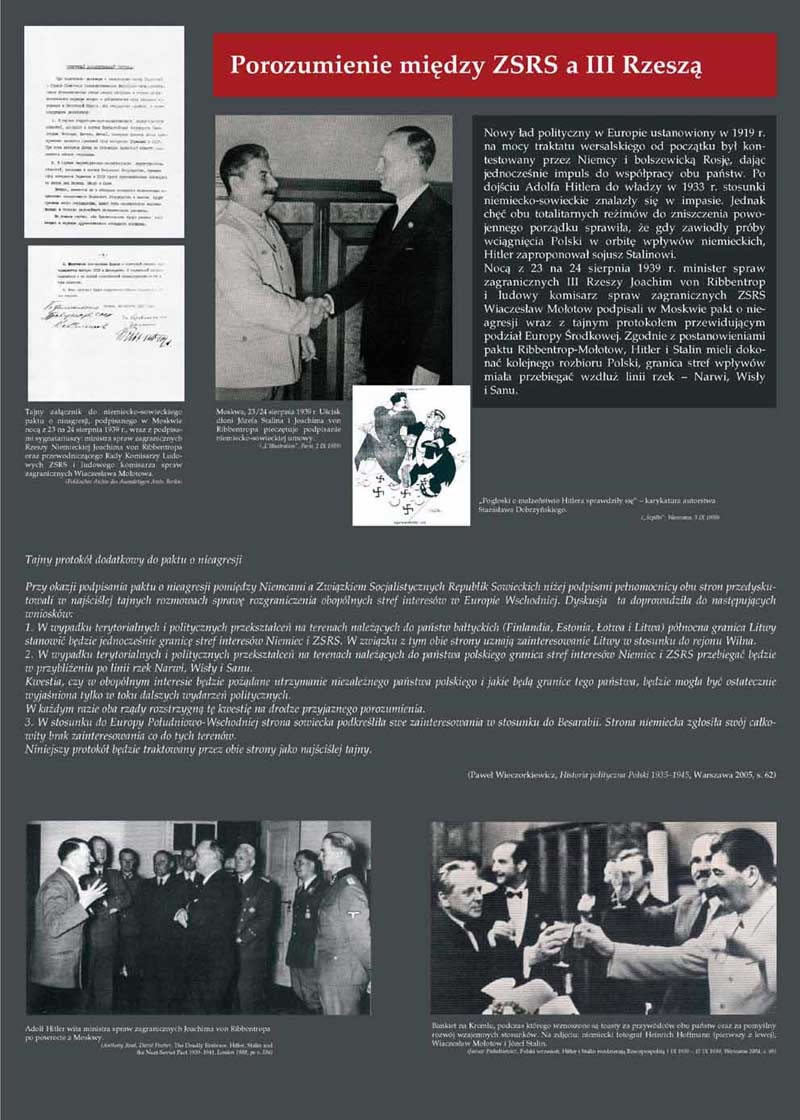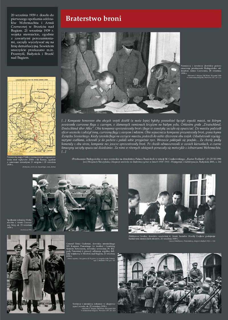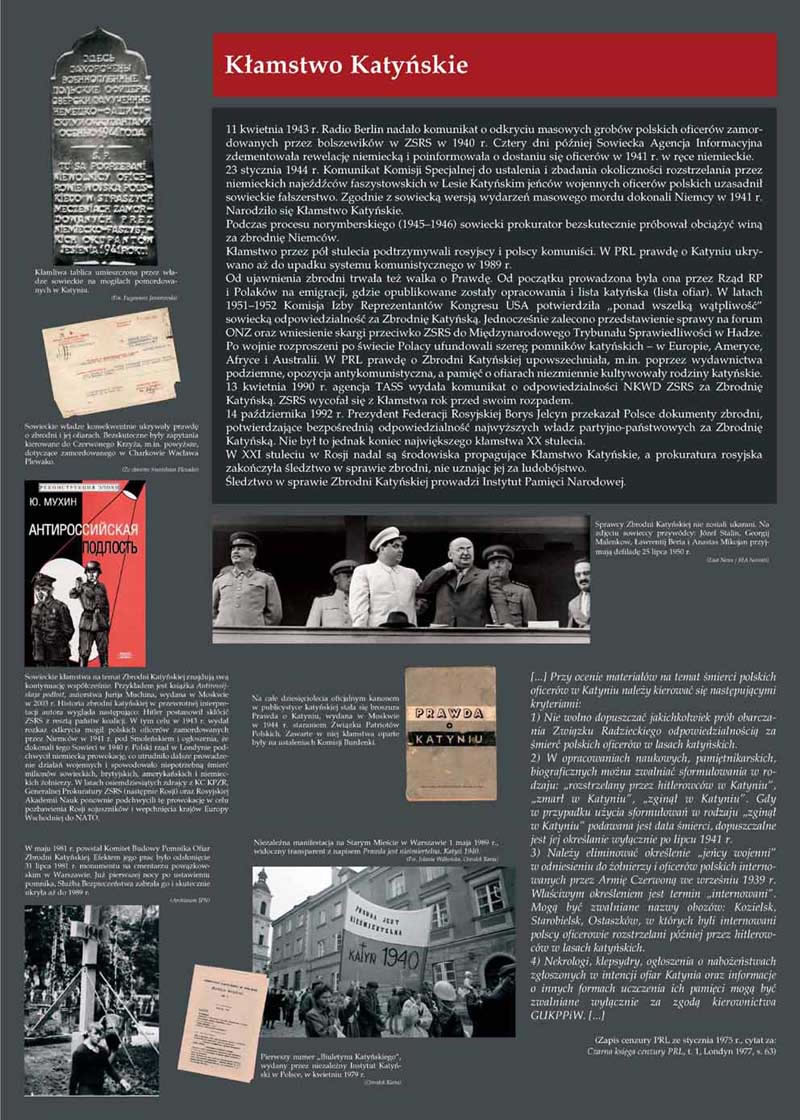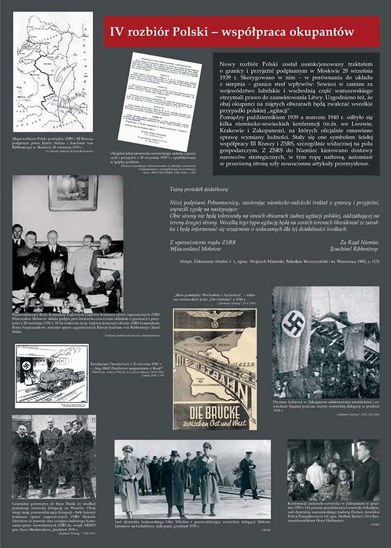 Wystawa podzielona została na kilka bloków tematycznych. W pierwszym naświetlono sowiecko-niemieckie przymierze polityczne i wojskowe z lat 1939–1941. Ukazano wspólną agresję na Polskę, jej rozbiór oraz okupację, w trakcie której współpracujące ze sobą mocarstwa wprowadzały w życie ludobójczą politykę wobec obywateli podbitego kraju. W kolejnych blokach zaprezentowane zostały obie zbrodnicze operacje z 1940 r., najpierw Zbrodnia Katyńska, a następnie akcja AB. Zrekonstruowane zostały przygotowania do zbrodni, jej przebieg oraz najważniejsi sprawcy. Przybliżone zostały przykładowe sylwetki ofiar, w tym także rodzin: Czarnków, Wnuków, Dowbor-Muśnickich i Chrzanowskich, które stały się jednocześnie ofiarami obu oprawców. Podsumowaniem wystawy jest próba bilansu ludobójczych operacji, ukazanie ich geograficznego zasięgu oraz faktu nieukarania znakomitej większości odpowiedzialnych za nią funkcjonariuszy III Rzeszy i ZSRS, zwłaszcza sprawców Zbrodni Katyńskiej.
