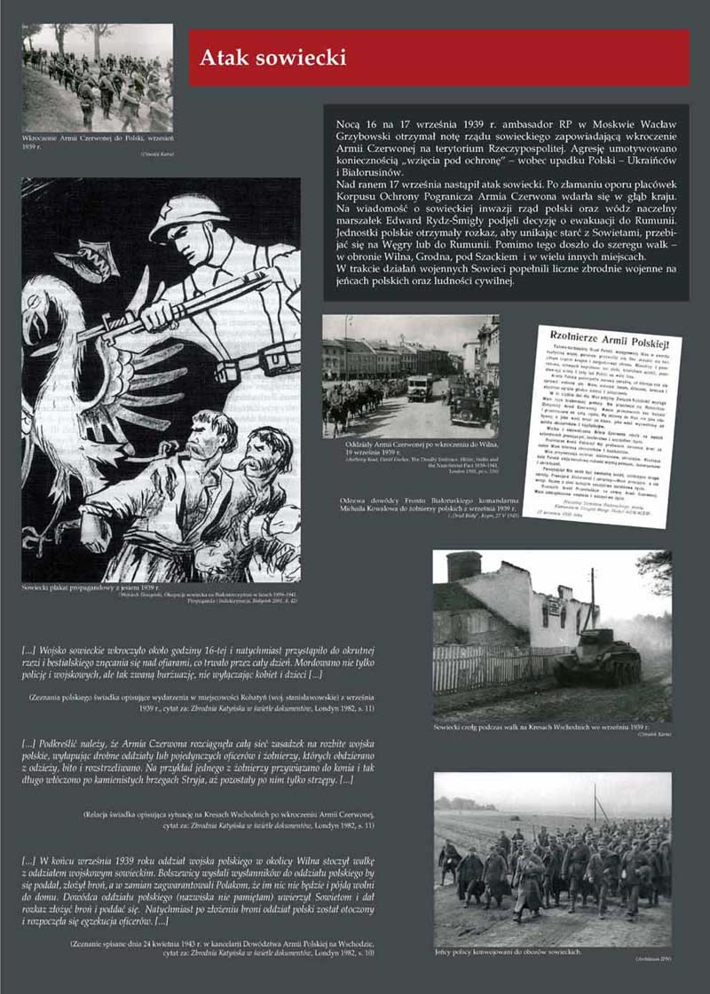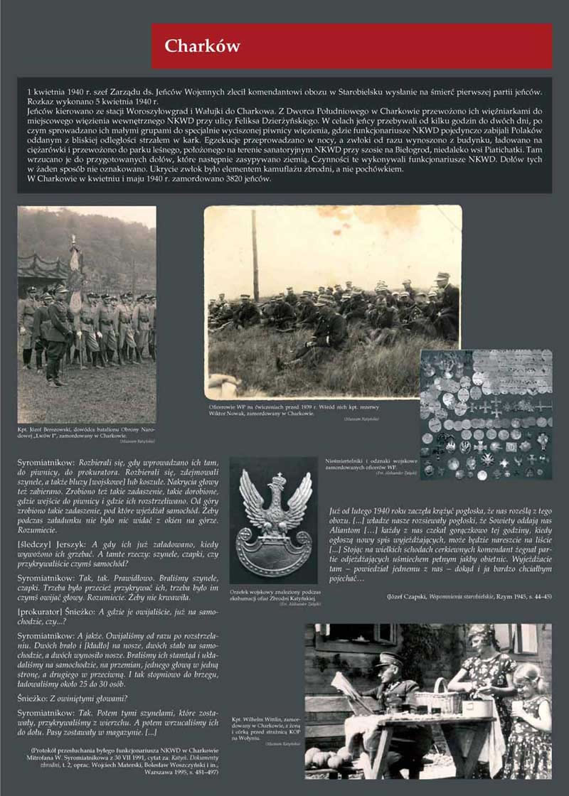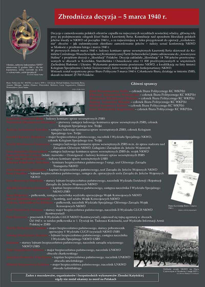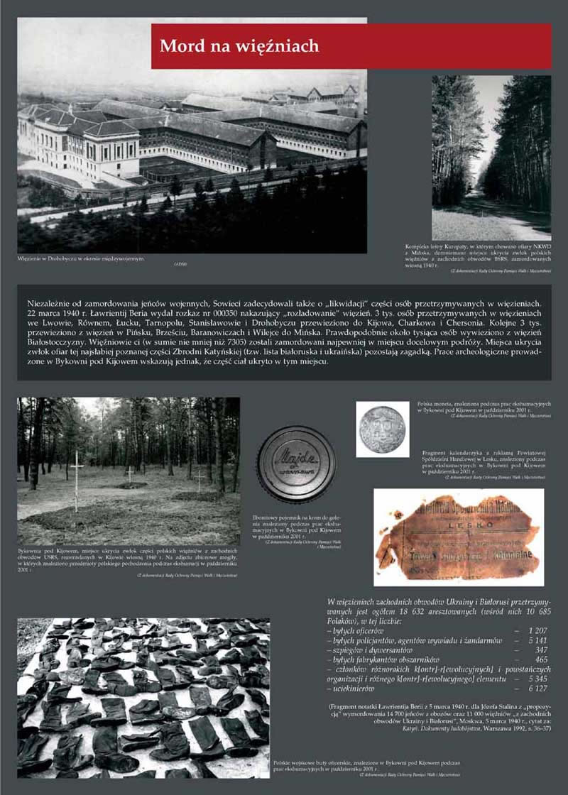 Masowe aresztowania miały również miejsce na terenach pod okupacją sowiecką. W pierwszych dniach marca 1940 r. Ludowy Komisarz Spraw Wewnętrznych Ławrientij Beria skierował do Komitetu Centralnego Wszechzwiązkowej Komunistycznej Partii (bolszewików) pismo z projektem decyzji o likwidacji 14 700 jeńców znajdujących się w obozach w Kozielsku, Starobielsku i Ostaszkowie oraz 11 tys. przetrzymywanych w więzieniach tzw. zachodniej Ukrainy i Białorusi. Wniosek został rozpatrzony przez Biuro Polityczne 5 marca 1940 roku. Na początku kwietnia 1940 r. ruszyły pierwsze transporty do miejsc egzekucji w Katyniu, Charkowie i Kalininie (Twerze), gdzie jeńcy byli rozstrzeliwani strzałem w tył głowy. Osoby przetrzymywane w więzieniach we Lwowie, Równem, Łucku, Tarnopolu, Stanisławowie i Drohobyczu przewieziono do Kijowa, Charkowa i Chersonia. Z kolei przetrzymywani w więzieniach w Pińsku, Brześciu, Baranowiczach i Wilejce zostali przewiezieni do Mińska. Więźniowie ci (w sumie nie mniej niż 7305 osób) zostali zlikwidowani najpewniej w miejscu docelowym podróży.