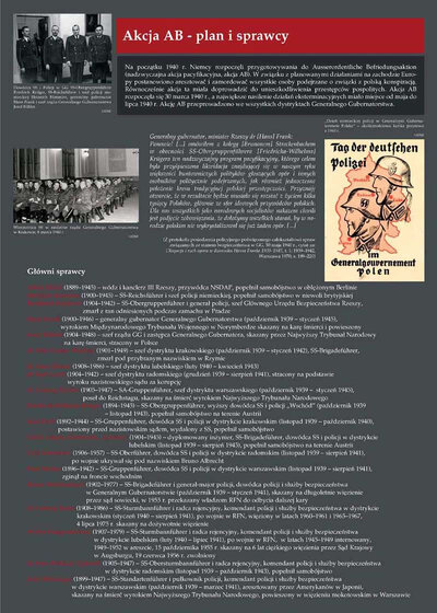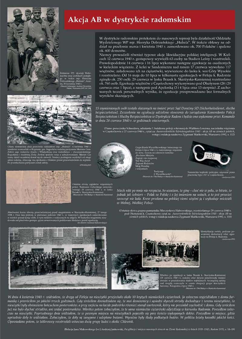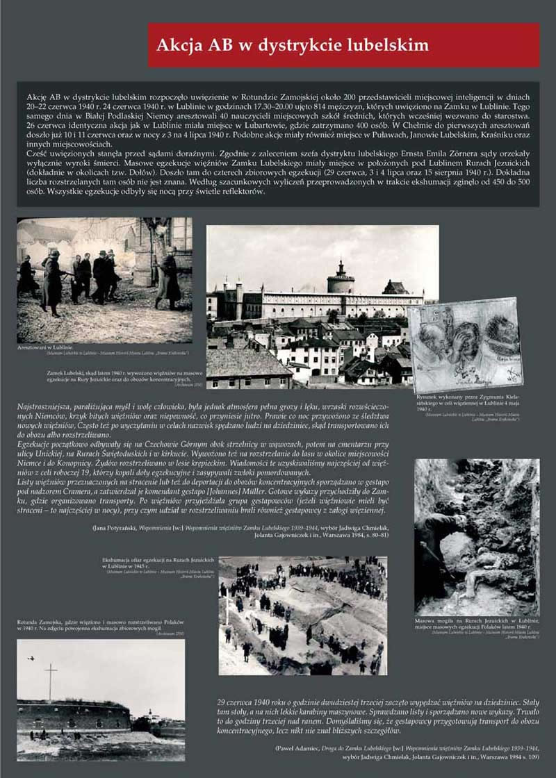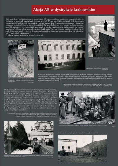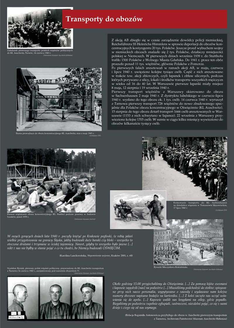 Jesienią 1939 r. na ziemiach wcielonych do Rzeszy, przede wszystkim na Pomorzu i w Wielkopolsce, doszło do masowych egzekucji polskiej inteligencji. Jednocześnie ok. 460 tys. Polaków wypędzono z tych ziem na tereny Generalnego Gubernatorstwa (GG). Na początku 1940 r. akcję represyjną Ausserordentliche Befriedungsaktion (Nadzwyczajna Akcja Pacyfikacyjna) postanowiono przeprowadzić również w GG. Ostrze represji zasadniczo skierowano przeciwko osobom podejrzewanym o związki z konspiracją niepodległościową – równocześnie akcja ta miała doprowadzić do unieszkodliwienia przestępców pospolitych. Akcja AB rozpoczęła się 30 marca 1940 r., a jej pierwszym akordem była krwawa pacyfikacja terenów objętych działalnością oddziału partyzanckiego „Hubala”. Nasilenie działań eksterminacyjnych nastąpiło w okresie od maja do lipca 1940 r. Największe egzekucje miały miejsce w Palmirach pod Warszawą, na Rurach Jezuickich w Lublinie, na Firleju pod Radomiem, w Skarżysku-Kamiennej i innych miejscach. Z akcją AB zbiegło się w czasie zarządzenie dowódcy policji niemieckiej, Reichsführera SS Heinricha Himmlera w sprawie deportacji do obozów koncentracyjnych 20 tys. Polaków. Część z nich aresztowano w trakcie tzw. akcji zbiorczych, czyli łapanek, obław ulicznych, podczas których porywano z ulicy, lokali, środków transportu wszystkich mężczyzn od 16 do 40 lat. Pierwszy transport więźniów z Warszawy skierowano do obozu w Sachsenhausen 2 maja 1940 r. 14 czerwca 1940 r. wyruszył z Tarnowa pierwszy transport więźniów do nowo zbudowanego specjalnie dla Polaków (a znanego dziś z dokonanej tam później zagłady Żydów) obozu koncentracyjnego w Auschwitz. W sumie w ciągu kilku miesięcy wywieziono wówczas kilkanaście tysięcy osób.