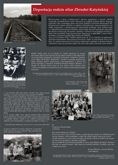 Równocześnie z akcją „rozładowania” obozów specjalnych i więzień NKWD poddało prześladowaniom rodziny skazanych na zagładę polskich jeńców. 13 kwietnia deportowano do północnych obwodów Kazachstanu ok. 61 tys. Polaków. Wywożonym pozwolono zabrać ze sobą jedynie rzeczy osobiste. Na miejscu kierowano ich do pracy w kołchozach, osiedlając w skrajnie trudnych warunkach, często na otwartym stepie.