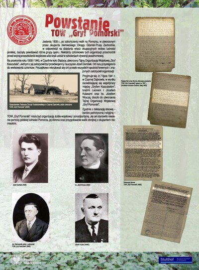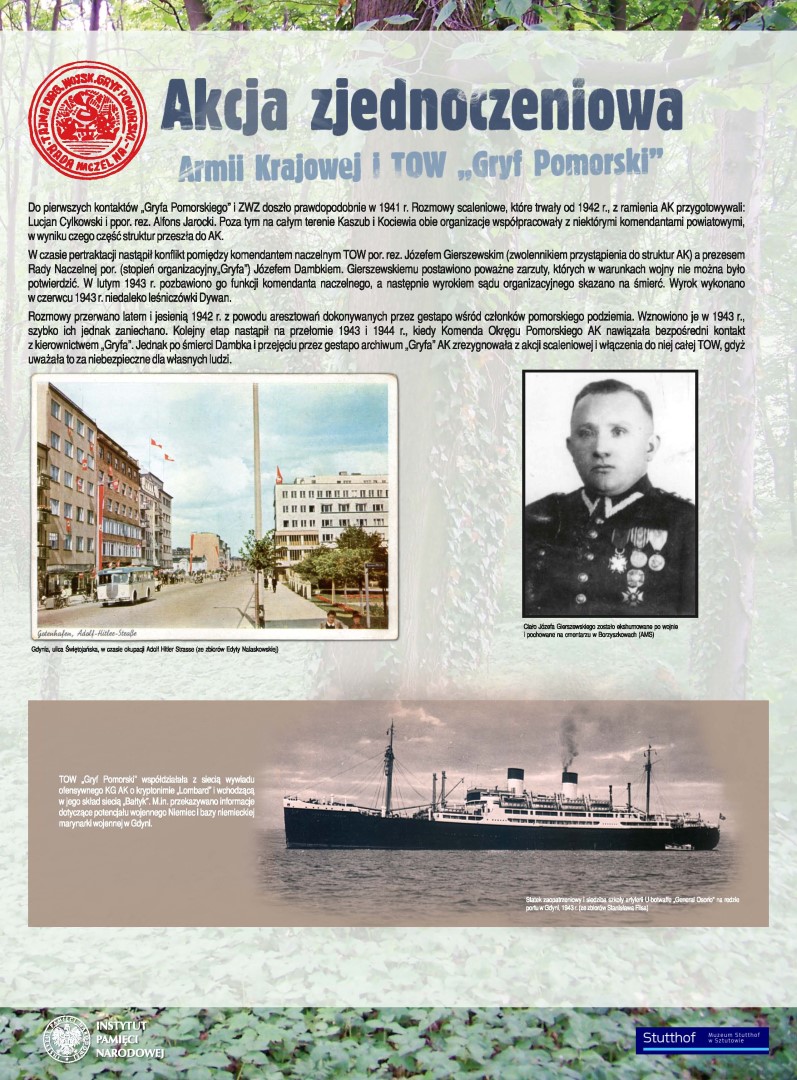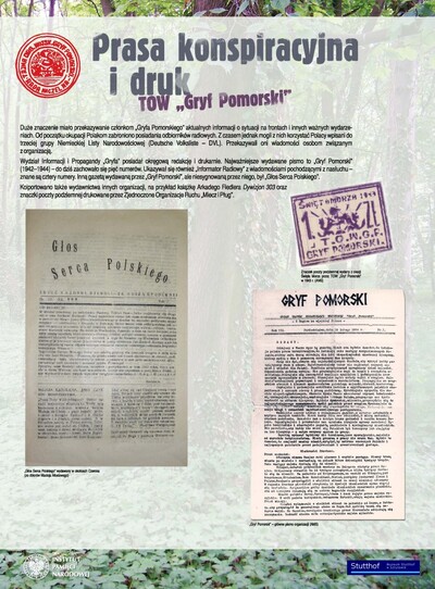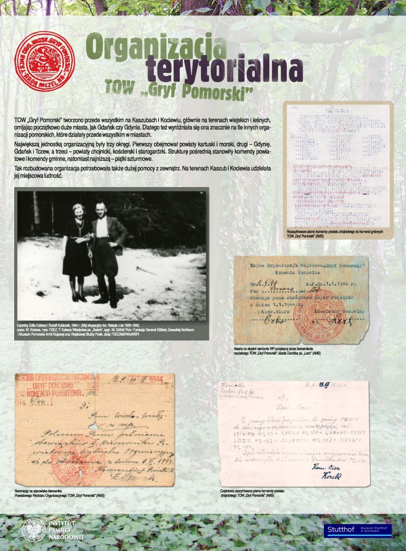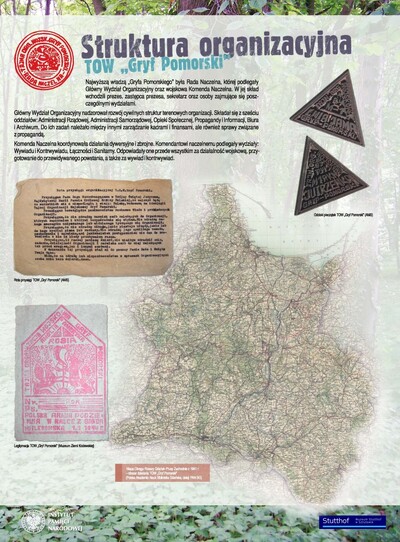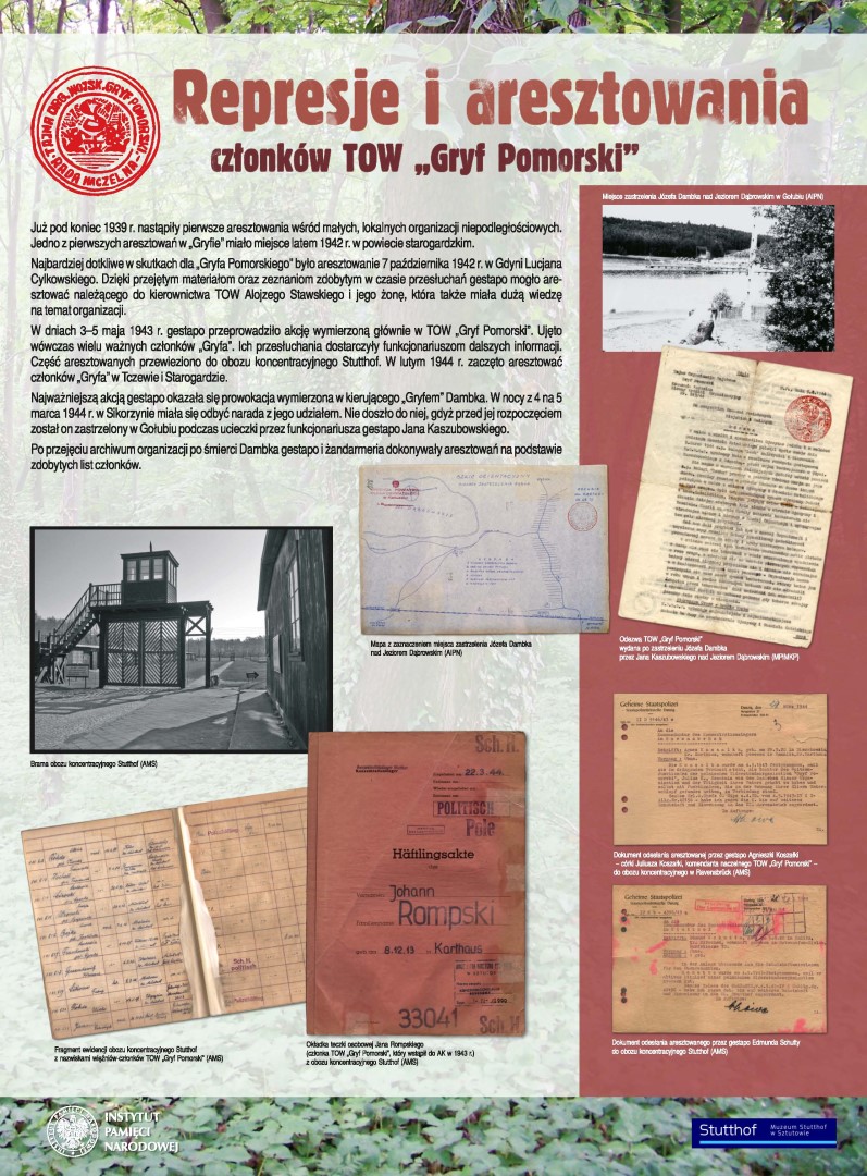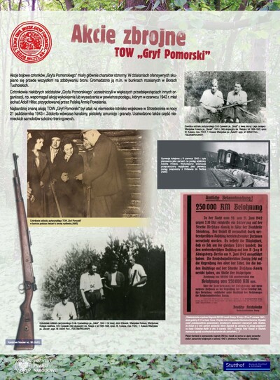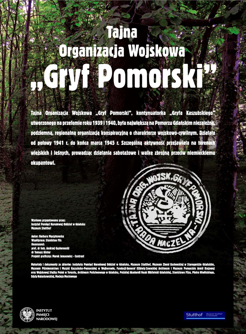 Wystawa jest pierwszą próbą zaprezentowana w takiej postaci historii TOW „Gryf Pomorski”. Na łącznie 15 panelach przedstawiono powstanie, struktury, działalność i czołowe postacie TOW „Gryf Pomorski”, a także represje, jakie spotkały członków tej podziemnej organizacji po 1945 r. Prezentowany materiał ilustracyjny oraz archiwalny zaczerpnięty został nie tylko ze zbiorów instytucji państwowych (archiwa, muzea, biblioteki), ale także z kolekcji osób prywatnych.