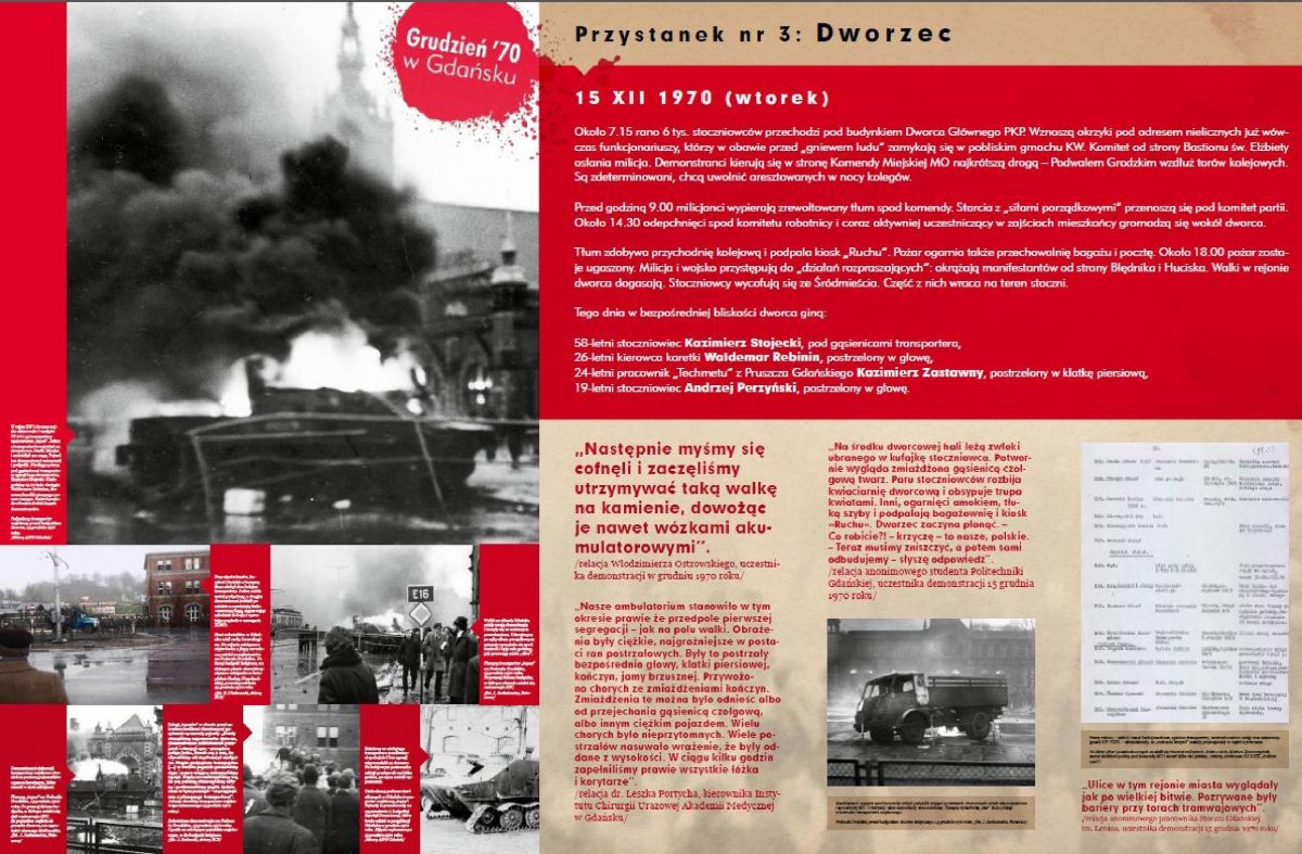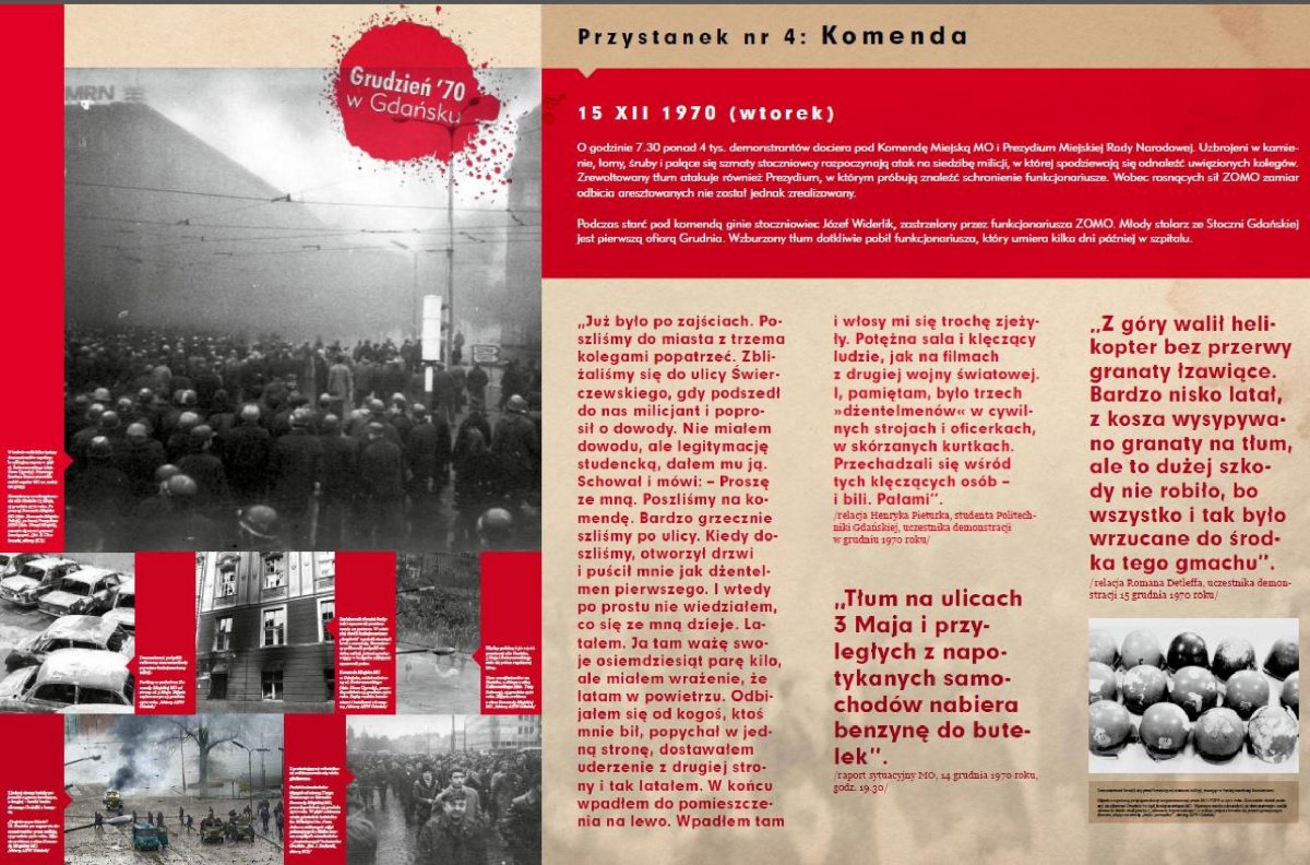 Tematyka wystawy koncentruje się na tragicznych trzech grudniowych dniach w Gdańsku – 14, 15 i 16 grudnia 1970 roku, kiedy miały miejsce starcia demonstrantów z milicją i wojskiem, zakończone krwawą pacyfikacją stoczni. Na treść ekspozycji składa się zarówno tekst właściwy, który jest próbą rekonstrukcji zdarzeń w pięciu najbardziej zapalnych punktach zrewoltowanego miasta (Stocznia, wiadukt Błędnik, Dworzec Główny PKP, Komenda Miejska MO, budynek KW PZPR), jak również bogaty materiał zdjęciowy (w tym zdjęcia pokolorowane), cytaty uczestników starć „z dwóch stron barykady” i fragmenty poezji „grudniowej”. Autorem wystawy jest Bartosz Januszewski, pracownik Oddziałowego Biura Edukacji Narodowej IPN w Gdańsku.