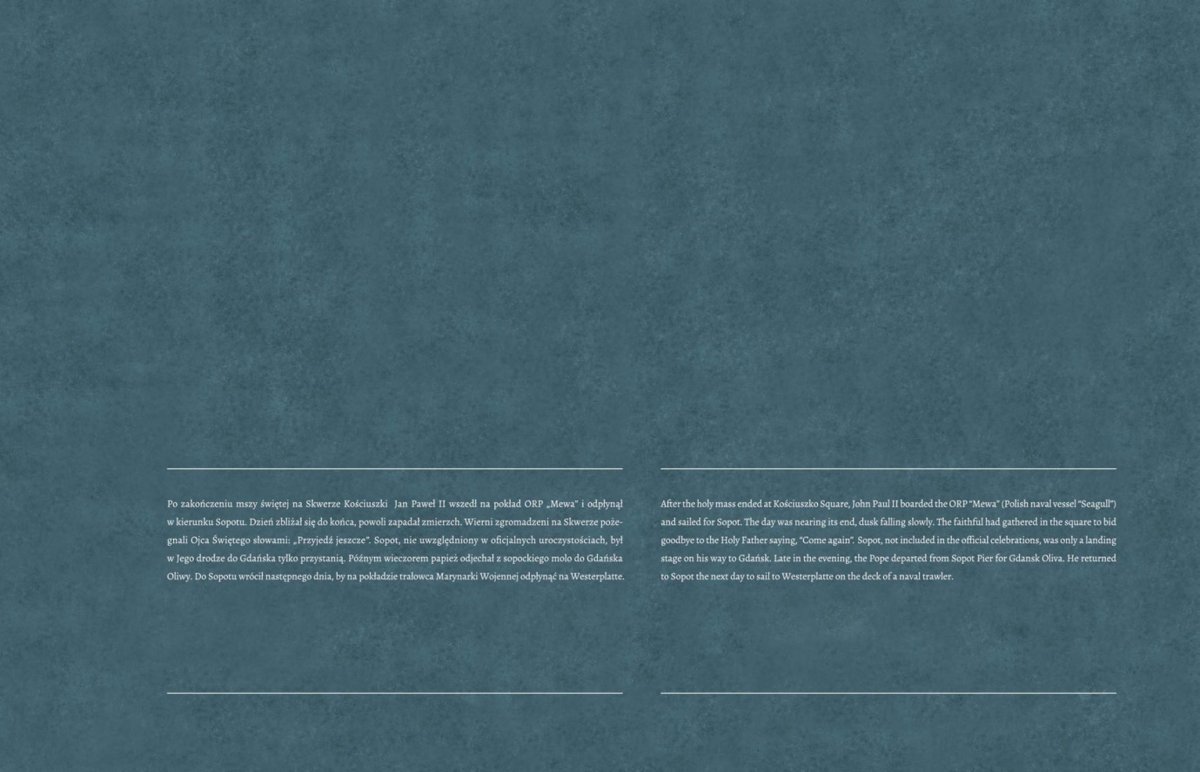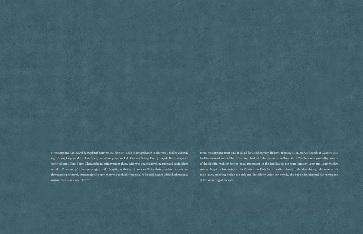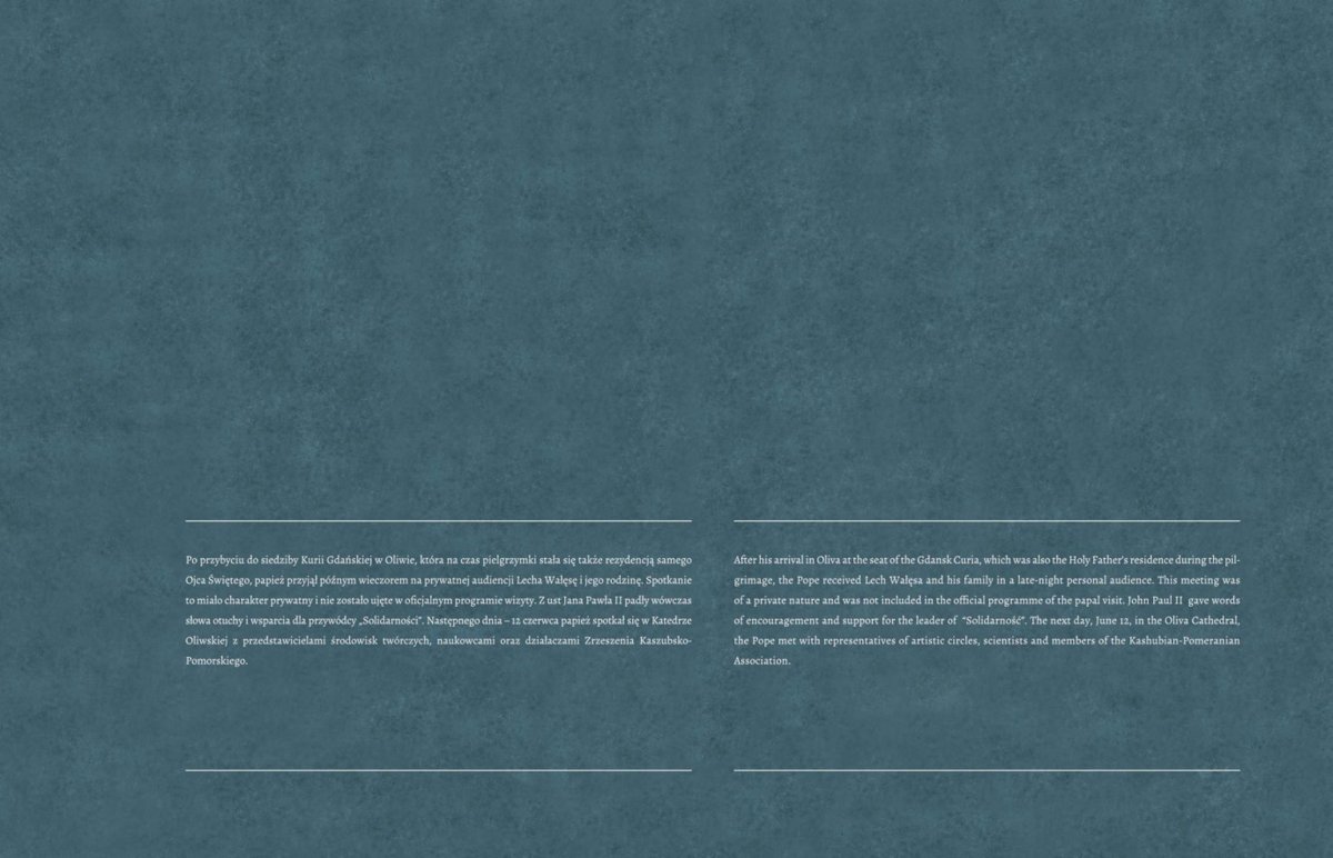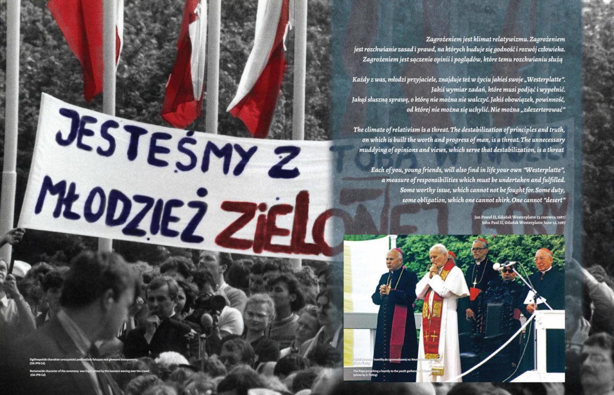 Na 13 dwustronnych panelach w przystępny sposób przedstawiono najważniejsze wydarzenia związane z przebiegiem wizyty Jana Pawła II w Trójmieście w dniach 11 i 12 czerwca 1987 r., a więc uroczystości z udziałem papieża w Gdyni, moment przejścia Ojca Świętego przez sopockie molo (Sopot nie został uwzględniony w oficjalnych uroczystościach i był tylko przystanią w drodze Jana Pawła II do Gdańska), spotkanie papieża z Lechem Wałęsą i jego rodziną Oliwie, spotkanie Ojca Świętego z przedstawicielami środowisk twórczych, naukowcami i działaczami ZK-P w Oliwie, mszę św. na Westerplatte i spotkanie z młodzieżą, spotkanie papieża z osobami chorymi i cierpiącymi w Bazylice Mariackiej, modlitwę Jana Pawła II pod Pomnikiem Poległych Stoczniowców a także mszę św. na Zaspie. Ostatnia plansza pokazuje manifestację po mszy św. odprawionej przez Jana Pawła II dla ludzi pracy na gdańskiej Zaspie – przez ulice Gdańska przelała się wówczas prawdziwa fala „Solidarności”. Autorami wystawy są Sławomir Formella i Elżbieta Strehlau, starsi archiwiści Oddziałowego Archiwum IPN w Gdańsku.