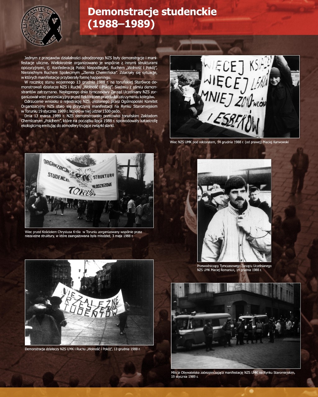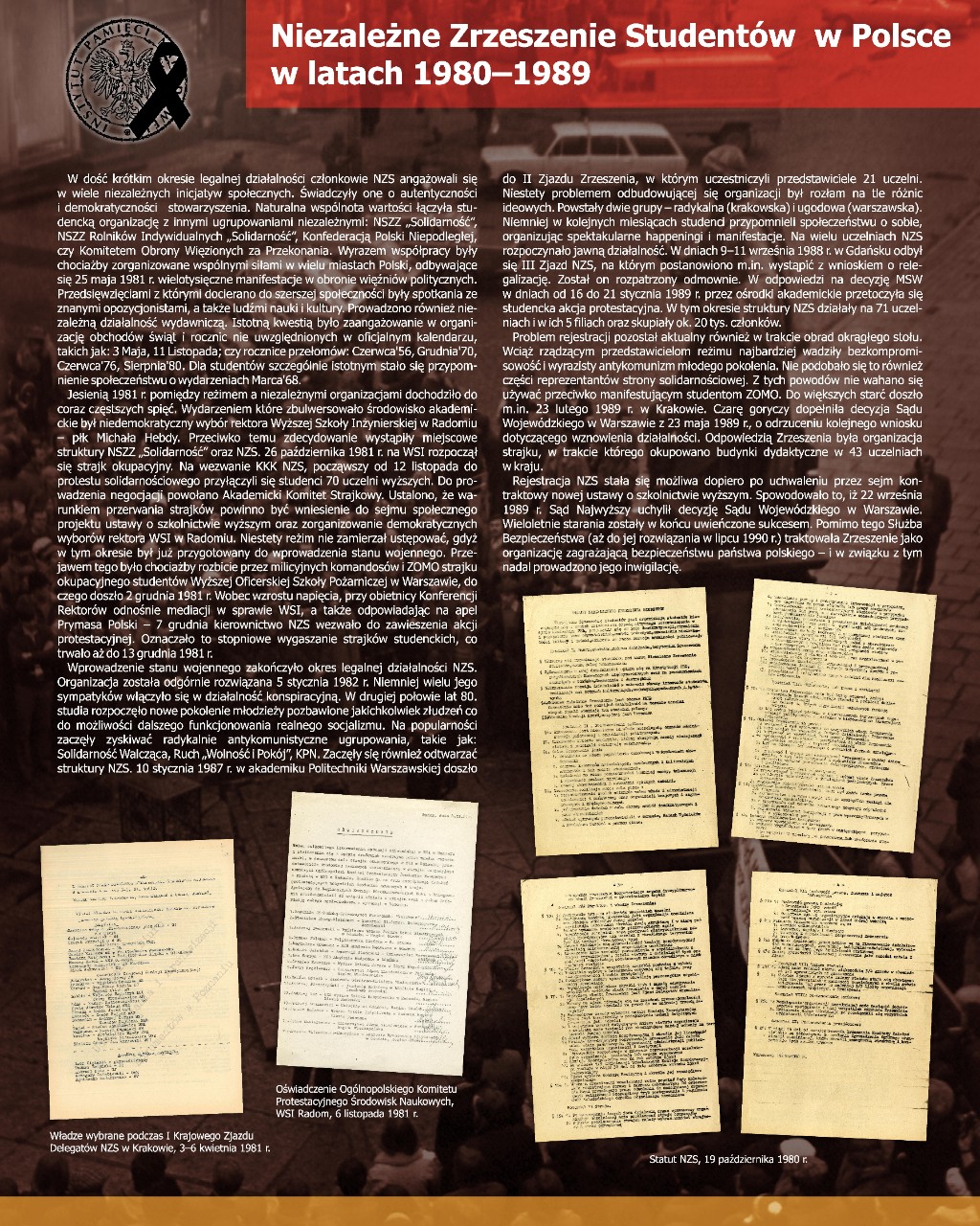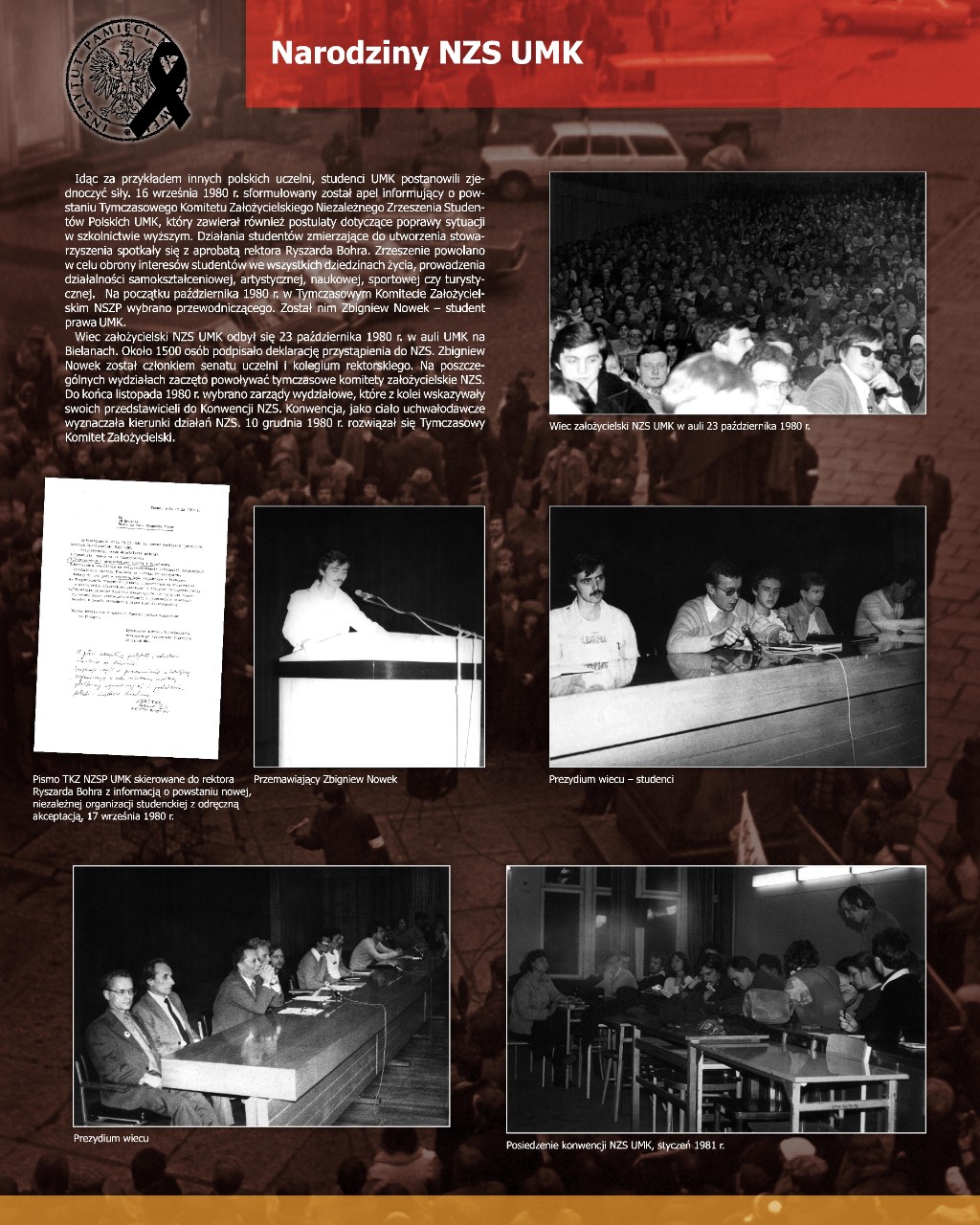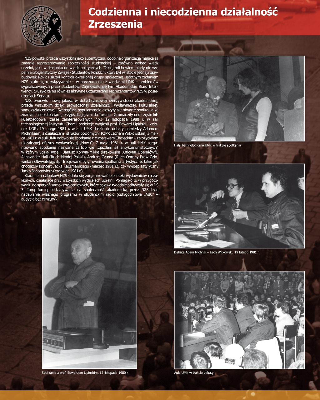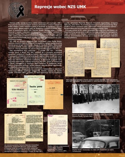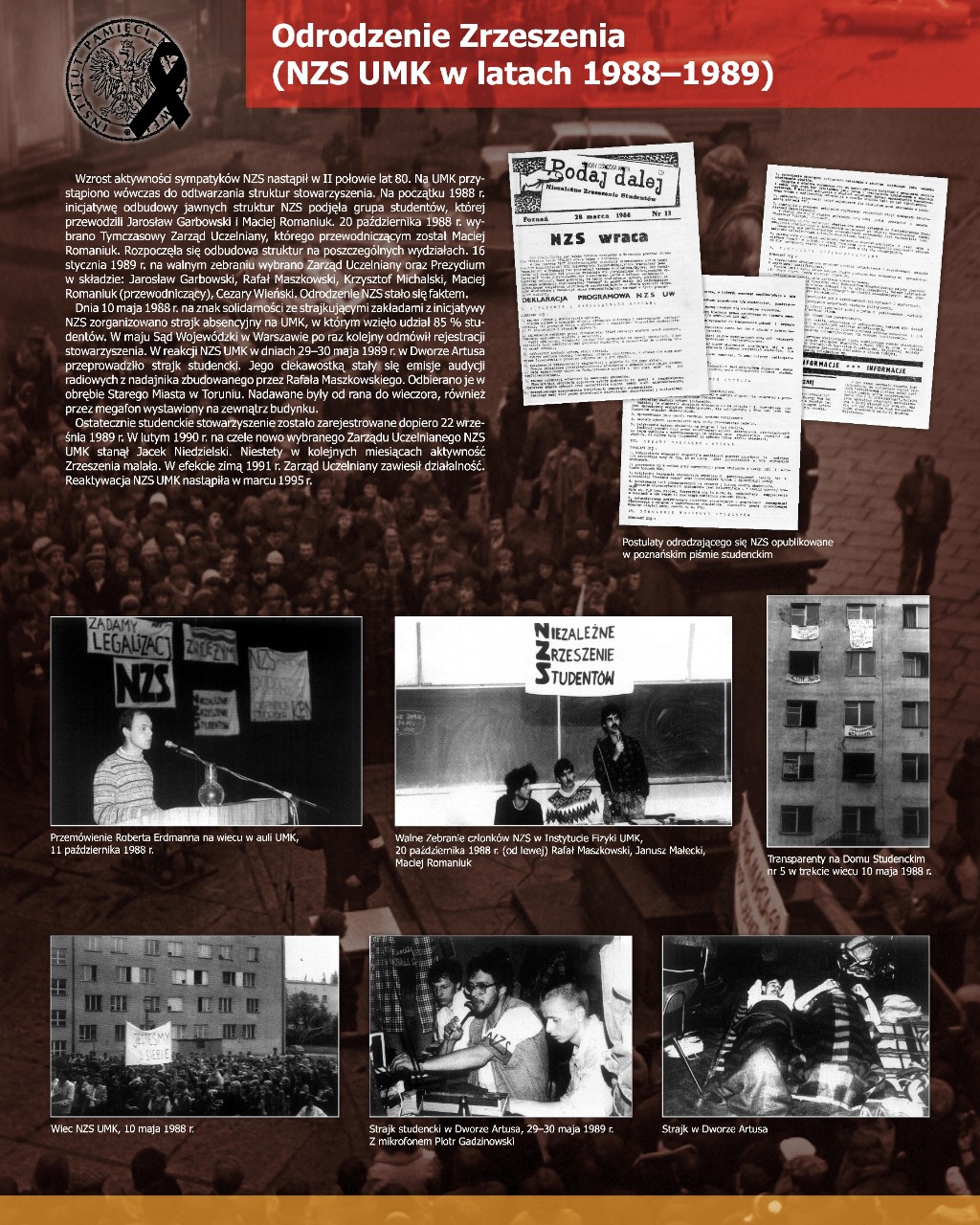 Rozbudowana prezentacja najważniejszych wydarzeń związanych z działalnością Niezależnego Zrzeszenia Studentów w Toruniu. Na trzydziestu planszach zamieszczono informacje o działalności NZS w latach osiemdziesiątych – od tworzenia struktur na Uniwersytecie Mikołaja Kopernika, poprzez przedstawienie legalnej działalności w latach 1980–1981, sylwetek najbardziej aktywnych działaczy, działalności wydawniczej i kolporterskiej, najważniejszych strajków studenckich, działań Służby Bezpieczeństwa wymierzonych w NZS, represji z okresu stanu wojennego (internowanie i skazywanie przez sąd działaczy Zrzeszenia) i działań konspiracyjnych w okresie 1982–1988, po likwidację organizacji w stanie wojennym i jej odrodzenie pod koniec lat osiemdziesiątych. Wystawa została po raz pierwszy zaprezentowana w 2010 r.