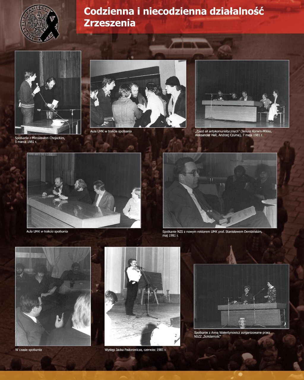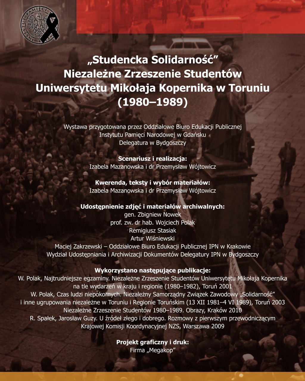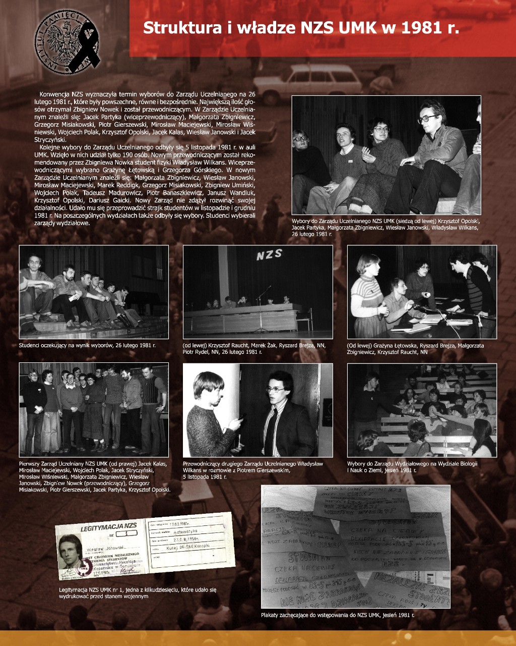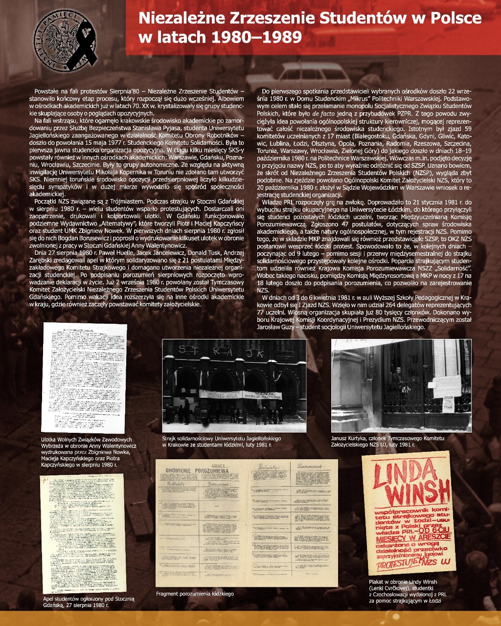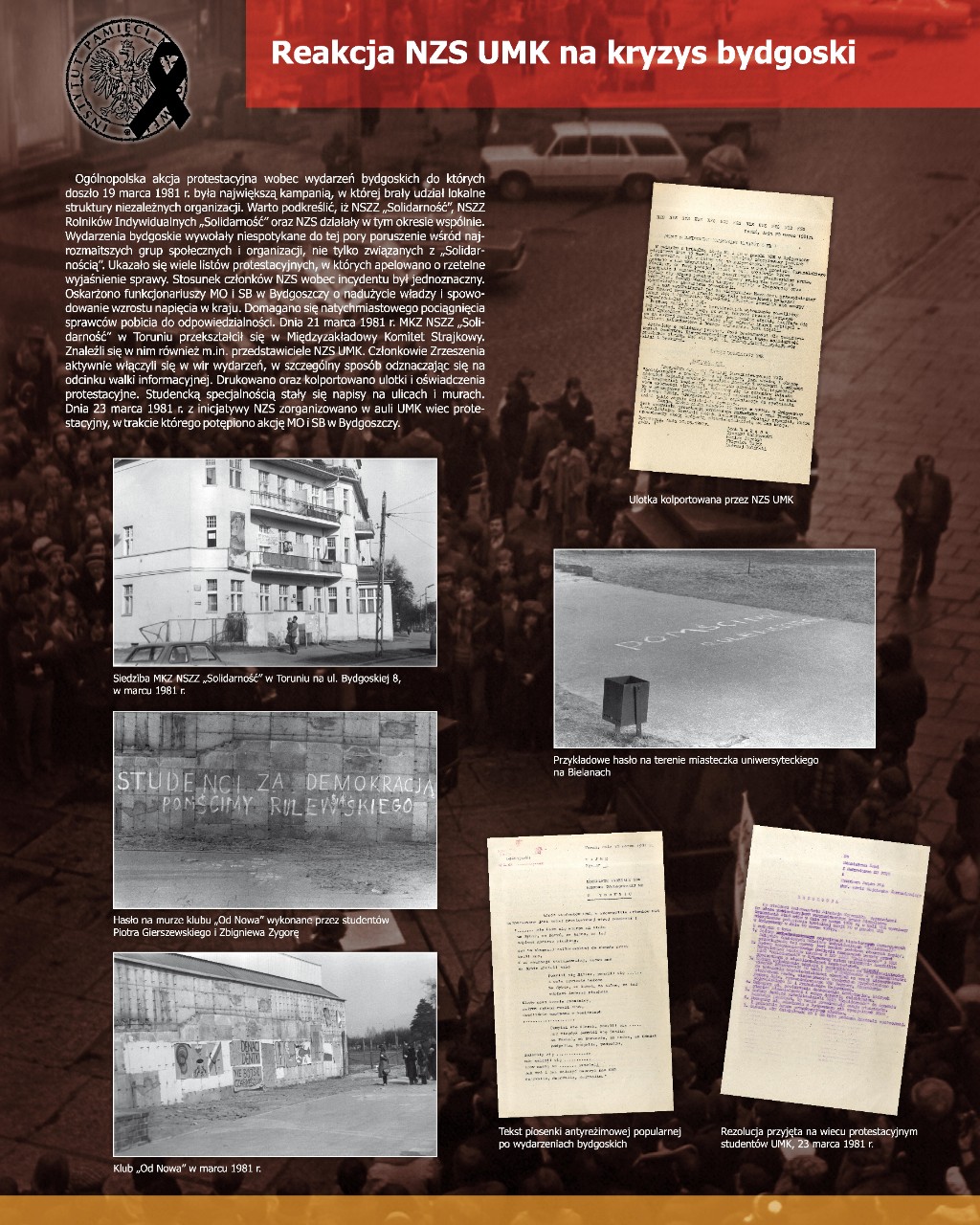 Rozbudowana prezentacja najważniejszych wydarzeń związanych z działalnością Niezależnego Zrzeszenia Studentów w Toruniu. Na trzydziestu planszach zamieszczono informacje o działalności NZS w latach osiemdziesiątych – od tworzenia struktur na Uniwersytecie Mikołaja Kopernika, poprzez przedstawienie legalnej działalności w latach 1980–1981, sylwetek najbardziej aktywnych działaczy, działalności wydawniczej i kolporterskiej, najważniejszych strajków studenckich, działań Służby Bezpieczeństwa wymierzonych w NZS, represji z okresu stanu wojennego (internowanie i skazywanie przez sąd działaczy Zrzeszenia) i działań konspiracyjnych w okresie 1982–1988, po likwidację organizacji w stanie wojennym i jej odrodzenie pod koniec lat osiemdziesiątych. Wystawa została po raz pierwszy zaprezentowana w 2010 r.