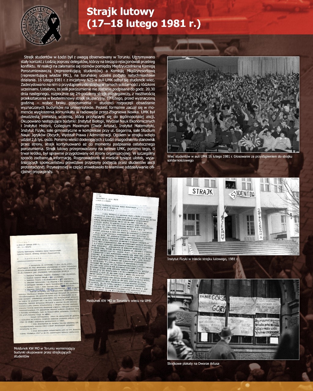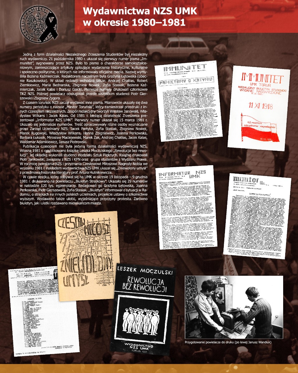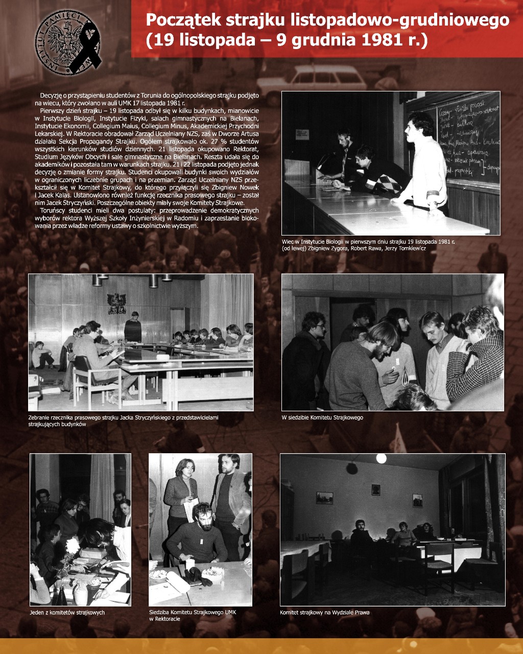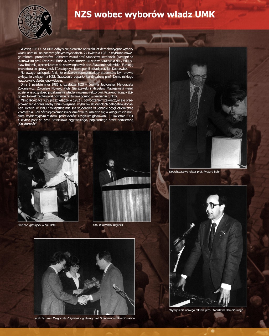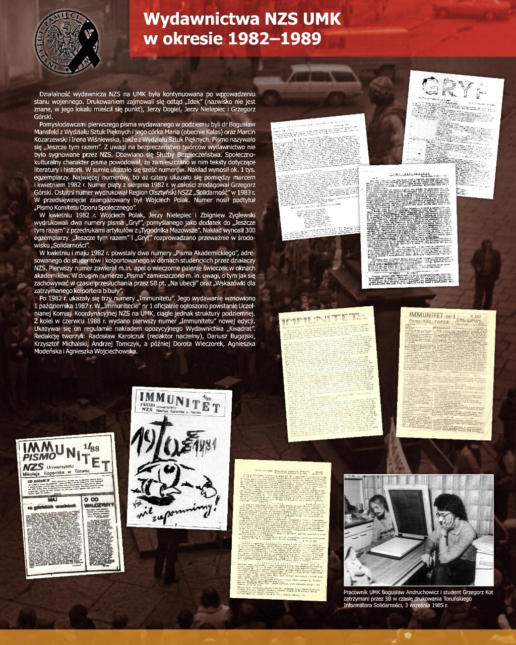 Rozbudowana prezentacja najważniejszych wydarzeń związanych z działalnością Niezależnego Zrzeszenia Studentów w Toruniu. Na trzydziestu planszach zamieszczono informacje o działalności NZS w latach osiemdziesiątych – od tworzenia struktur na Uniwersytecie Mikołaja Kopernika, poprzez przedstawienie legalnej działalności w latach 1980–1981, sylwetek najbardziej aktywnych działaczy, działalności wydawniczej i kolporterskiej, najważniejszych strajków studenckich, działań Służby Bezpieczeństwa wymierzonych w NZS, represji z okresu stanu wojennego (internowanie i skazywanie przez sąd działaczy Zrzeszenia) i działań konspiracyjnych w okresie 1982–1988, po likwidację organizacji w stanie wojennym i jej odrodzenie pod koniec lat osiemdziesiątych. Wystawa została po raz pierwszy zaprezentowana w 2010 r.
