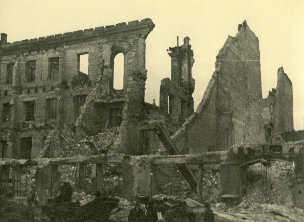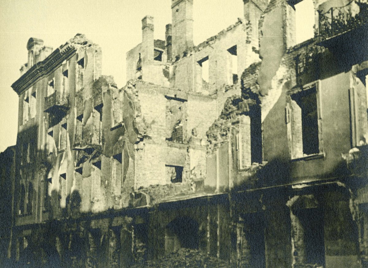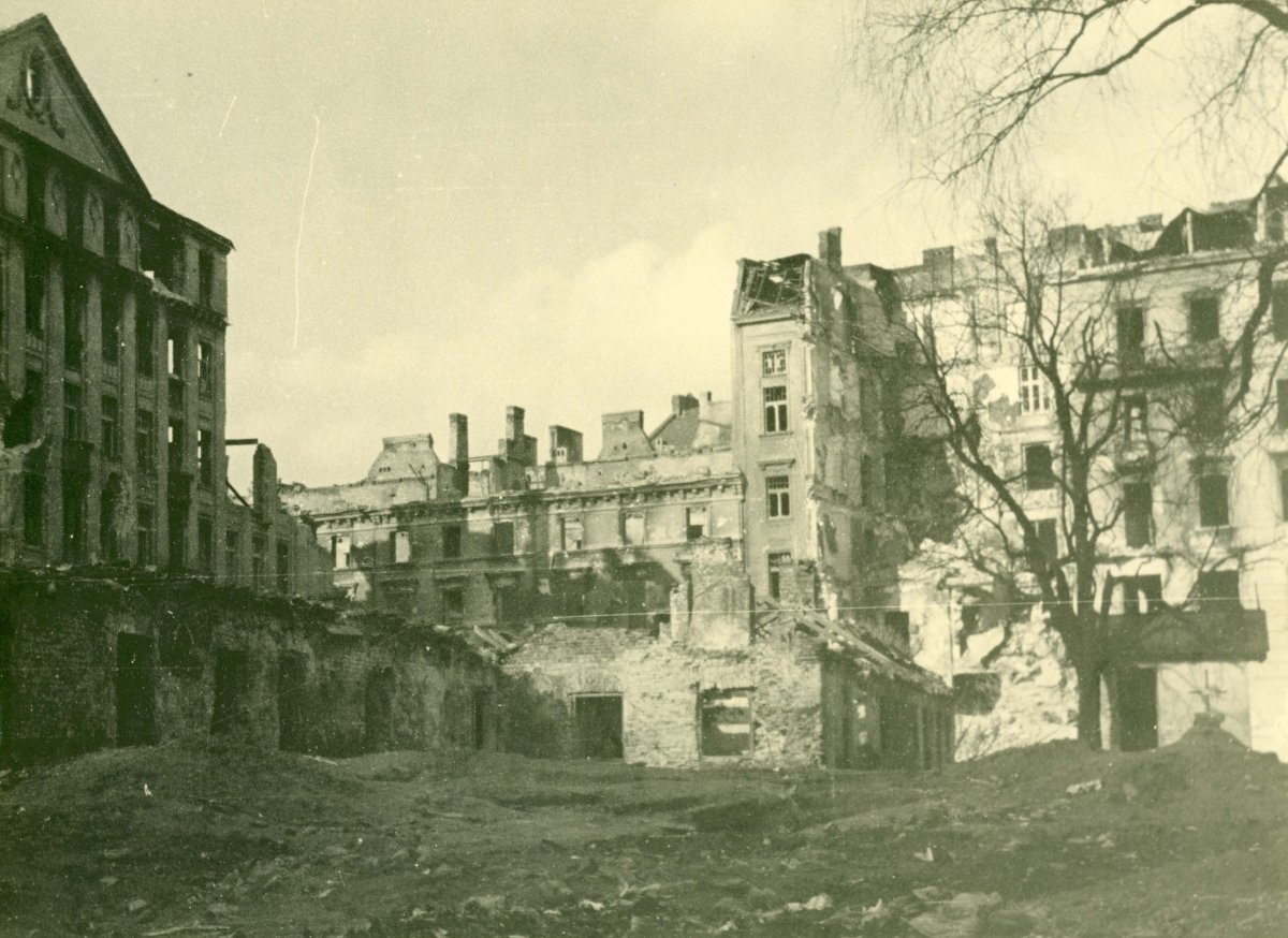 Zniszczona zabudowa północnej pierzei placu Piłsudskiego - widok w kierunku północnym. Widoczne ruiny spalonych kamienic przy ul. Wierzbowej 2 i ul. Ossolińskich 8 -