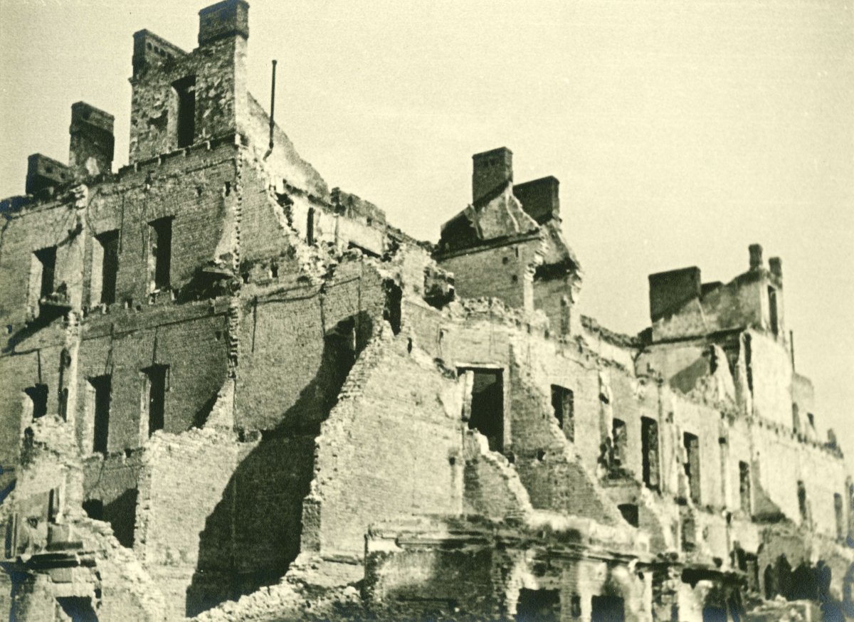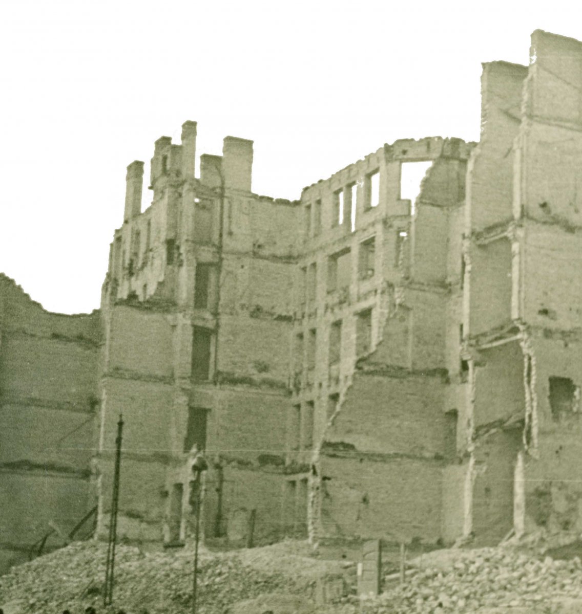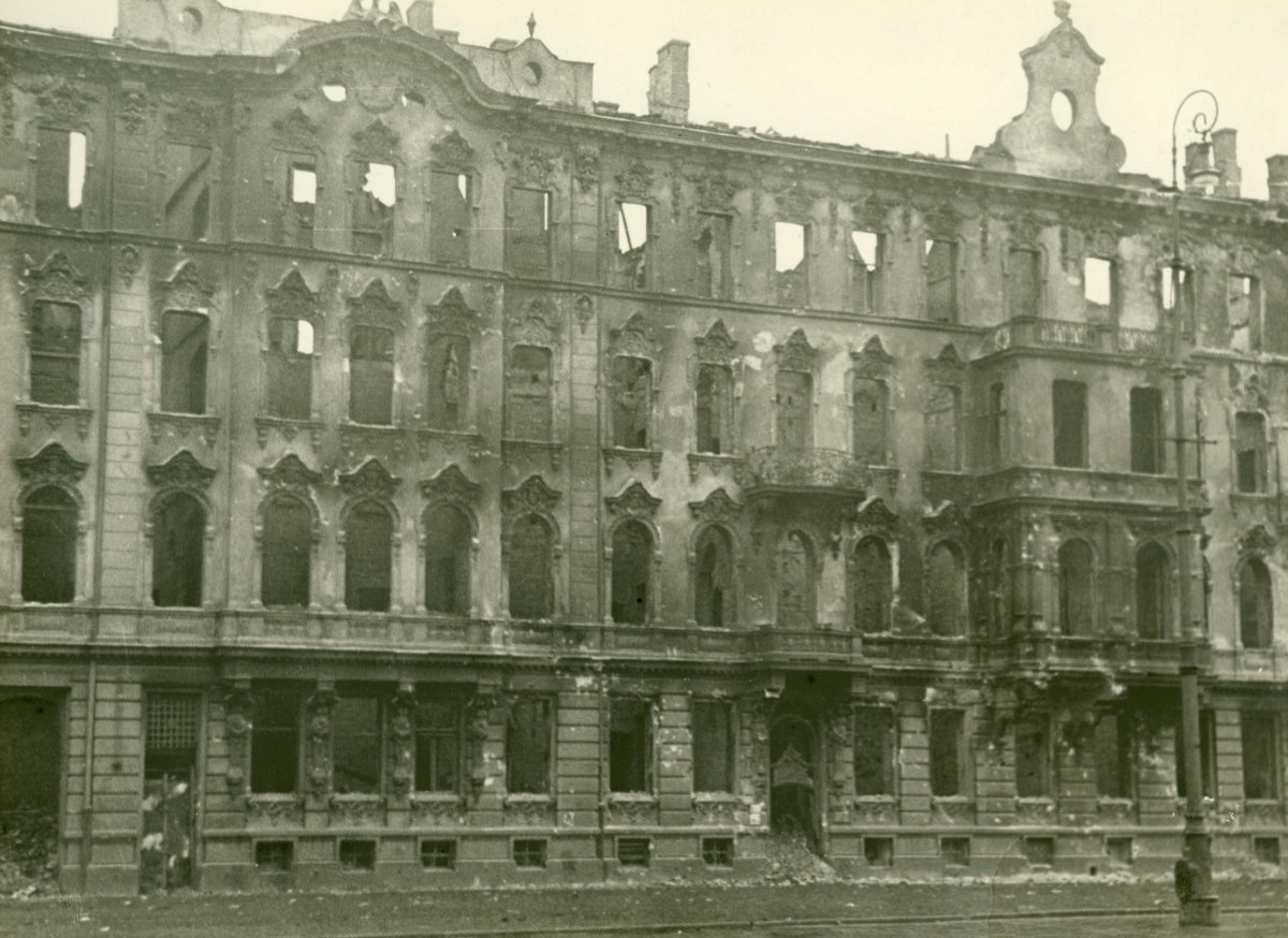 Zniszczona zabudowa północnej pierzei placu Piłsudskiego - widok w kierunku północnym. Widoczne ruiny spalonych kamienic przy ul. Wierzbowej 2 i ul. Ossolińskich 8 -