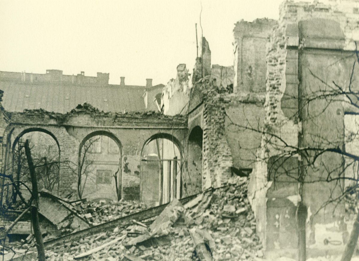 Zniszczone domy po północnej stronie ul. Ordynackiej - widok prawdopodobnie z rogu ul. Kopernika. Na końcu tzw. Dom Miłosierdzia, w tle po prawej budynek Konserwatorium Muzycznego -