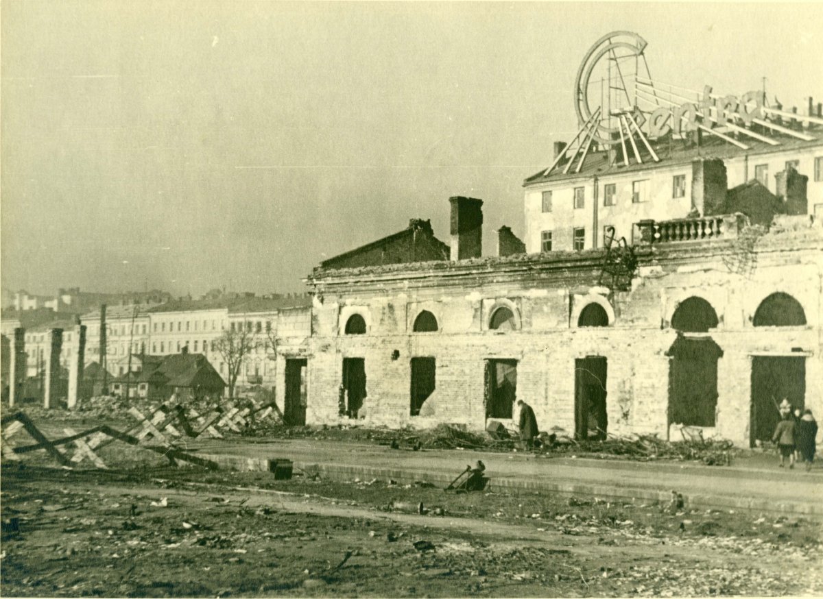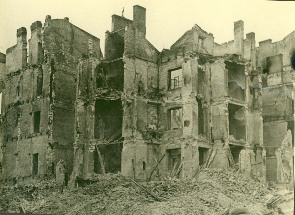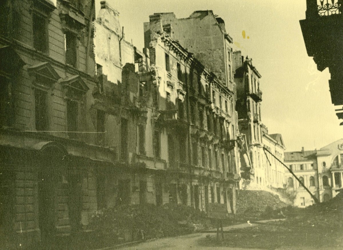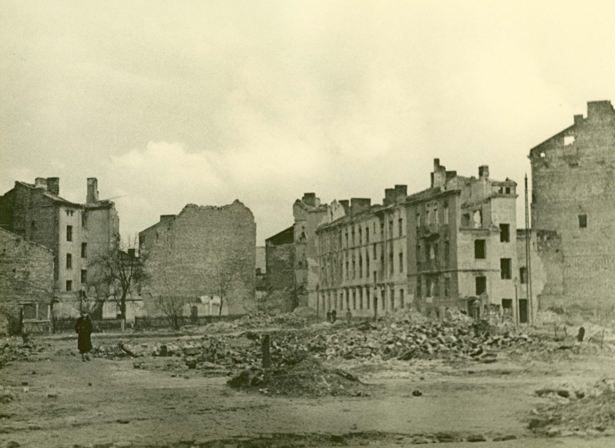 Ruiny zniszczonych budynków przy obecnie nieistniejącej ul. Wielkiej (współcześnie okolice placu Defilad) -