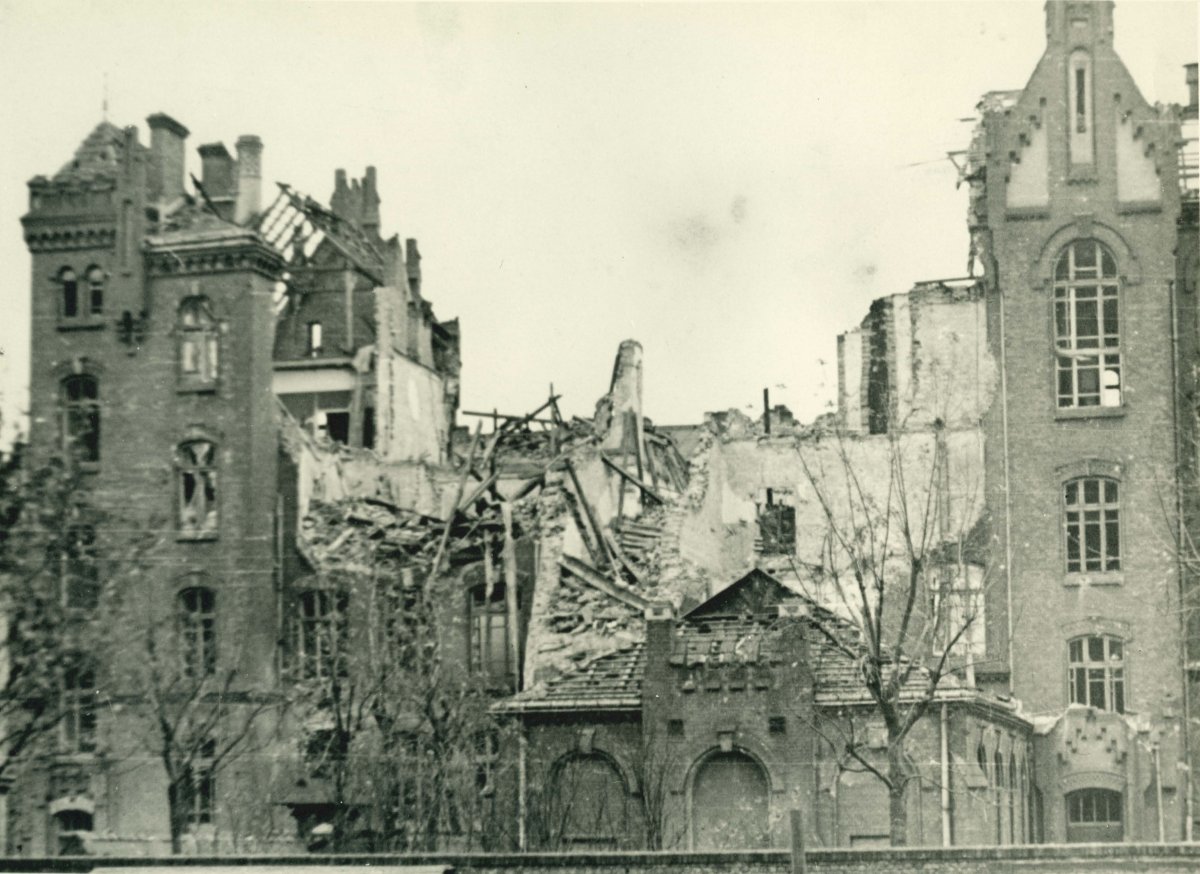 Zniszczony budynek Szkoły Powszechnej przy ul. Szerokiej (obecnie ul. ks. Ignacego Kłopotowskiego) -