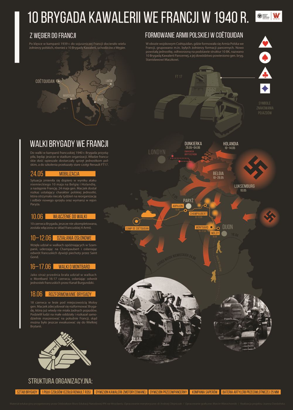 10. Brygada Kawalerii Pancernej przystąpiła do kampanii francuskiej 1940 r., znajdując się w stadium formowania. 24 maja gen. Maczek dostał rozkaz ustalający charakter jednostki, której dano niecały tydzień na reorganizację i odbiór nowego sprzętu oraz wymarsz w rejon Paryża. 10 czerwca Brygada, jeszcze nie ukompletowana, została włączona w skład francuskiej 4. Armii. Wzięła udział w walkach opóźniających w Szampanii, uderzając na Champaubert, aby osłaniać odwrót francuskich dywizji piechoty przez Saint Gond. Jako straż przednia brała udział w bitwie pod Montbard 16-17 czerwca, osłaniając odwrót jednostek francuskich przez Kanał Burgundzki. 18 czerwca w lesie pod miejscowością Moloy gen. Maczek zdecydował się rozformować Brygadę, już całkowicie pozbawioną pojazdów. Podzielił żołnierzy na małe oddziały i rozkazał maszerować samodzielnie na południe Francji, skąd można było jeszcze ewakuować się do Wielkiej Brytanii.
