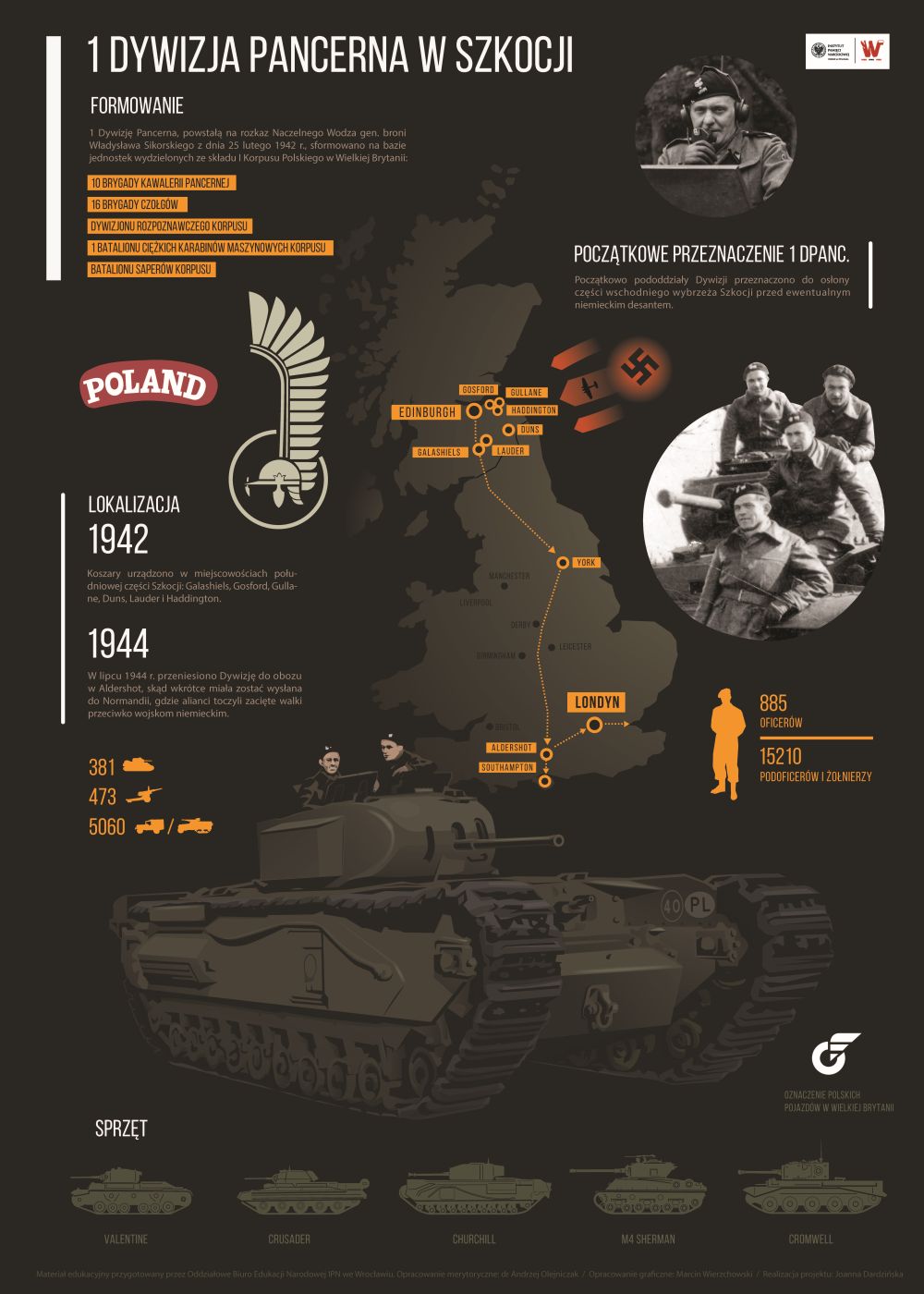 1. Dywizję Pancerną, powstałą na rozkaz Naczelnego Wodza gen. broni Władysława Sikorskiego z 25 lutego 1942 r., sformowano na podstawie jednostek wydzielonych ze składu I Korpusu Polskiego w Wielkiej Brytanii: 10. Brygady Kawalerii Pancernej, 16. Brygady Czołgów, Dywizjonu Rozpoznawczego Korpusu, 1. Batalionu Ciężkich Karabinów Maszynowych Korpusu, Batalionu Saperów Korpusu. Początkowo pododdziały Dywizji przeznaczono do ochrony wschodniego wybrzeża Szkocji przed spodziewanym niemieckim desantem. Koszary urządzono w miejscowościach południowej części Szkocji: Galashiels, Gosford, Gullane, Duns, Lauder i Haddington. Szkolenie prowadzono na sprzęcie brytyjskim, używając czołgów Valentine, Crusader i Churchill. Stan liczebny 1. Dywizji Pancernej wynosił w początkowym okresie: 885 oficerów, 15210 podoficerów i żołnierzy, 381 czołgów, 473 działa oraz 5060 pojazdów mechanicznych różnego przeznaczenia. Gdy do wojny przystąpiły Stany Zjednoczone, do Wielkiej Brytanii trafił także amerykański sprzęt pancerny i wówczas przezbrojono część pododdziałów dywizji w czołgi M4 Sherman (1., 2. Pułk Pancerny, 24. Pułk Ułanów), w innych zaś posługiwano się nadal sprzętem brytyjskim (10. Pułk Strzelców Konnych używał czołgów Cromwell). W lipcu 1944 r. przeniesiono Dywizję do obozu w Aldershot, skąd wkrótce miała zostać wysłana do Normandii, gdzie alianci toczyli zacięte walki przeciwko wojskom niemieckim.