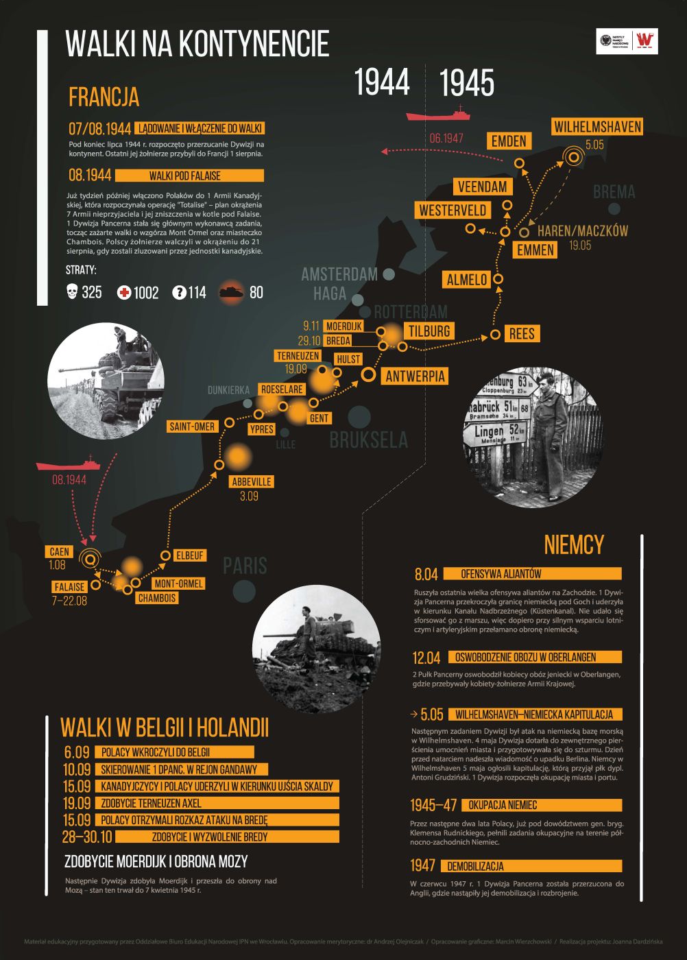 Po bitwie pod Falaise Niemcy zostali zmuszeni do odwrotu aż po brzeg Skaldy. Alianci podjęli pościg, do którego 29 sierpnia dołączyła 1. Dywizja Pancerna. W ciągu 9 dni pokonała ona odległość 400 km, staczając liczne walki z cofającym się nieprzyjacielem i zdobywając kolejne miasta. 6 września Polacy wkroczyli do Belgii. 10 września dowódca II Korpusu Kanadyjskiego skierował Dywizję w rejon Gandawy. 15 września Kanadyjczycy i Polacy uderzyli w kierunku ujścia Skaldy. 19 września zdobyto miasta Terneuzen oraz Axel. 27 października Polacy otrzymali rozkaz ataku na Bredę; po ciężkich walkach wyzwolili ją dwa dni później. Następnie Dywizja zdobyła Moerdijk i przeszła do obrony nad Mozą – do 7 kwietnia 1945 r.