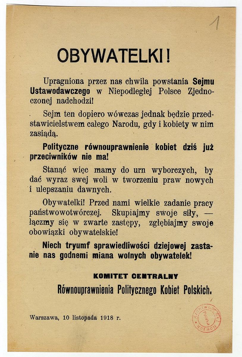 Wybory do Sejmu Ustawodawczego odbywały się na raty: w styczniu i czerwcu roku 1919 r. oraz w roku 1920. Przyznaniu praw wyborczych kobietom towarzyszyła intensywna dyskusja w prasie, od tytułów lewicowych, przez narodowe po konserwatywne. W wyniku wyborów do parlamentu Rzeczypospolitej Polskiej dostało się osiem posłanek: Gabriela Balicka (Związek Ludowo-Narodowy), Jadwiga Dziubińska (Polskie Stronnictwo Ludowe „Wyzwolenie”), Irena Kosmowska (Polskie Stronnictwo Ludowe „Wyzwolenie”), Maria Moczydłowska (Narodowe Zjednoczenie Ludowe), Zofia Moraczewska (Polska Partia Socjalistyczna), Anna Anastazja Piasecka (Narodowa Partia Robotnicza, następnie Polskie Stronnictwo Ludowe „Piast”), Zofia Sokolnicka (Narodowa Demokracja) i Franciszka Wilczkowiakowa (Narodowy Związek Robotniczy). Uzyskanie przez kobiety czynnego i biernego prawa wyborczego w 1918 r. stanowiło niewątpliwie milowy krok, lecz jednocześnie daleko jeszcze było do realizacji pełnego równouprawnienia.