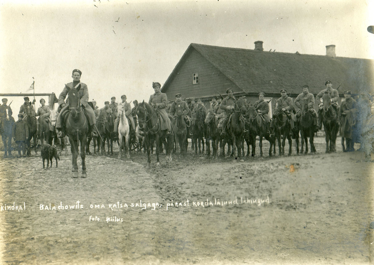 „W przebraniu przybyłem do Strug Białych, zaalarmowałem dywizjon, rozbroiłem sowieckie patrole i ruszyłem ku Pskowu, przebijając się do strefy neutralnej. […] postanowiłem połączyć się z organizacjami przeciwbolszewickimi i w miarę odchodzenia wojsk niemieckich walczyć za wolność krajów dążących do samodzielności. Za kilka dni odbył się odmarsz ich [Niemców] wojsk do Vaterlandu i jednocześnie marsz wojsk sowieckich na Psków. […] Psków był prawie bez boju oddany. Zostałem na głębokich tyłach; przebiłem się przez front otaczających wojsk sowieckich pod Izborskiem, stanąłem w nocy w pierwszych dniach listopada 1918 r. w zamku miasteczka Neugauzen, tam zebrałem większy oddział, wszedłem w kontakt z działaczami i dowódcami estońskich oddziałów, ogłaszając walkę za wolność Estonii”.