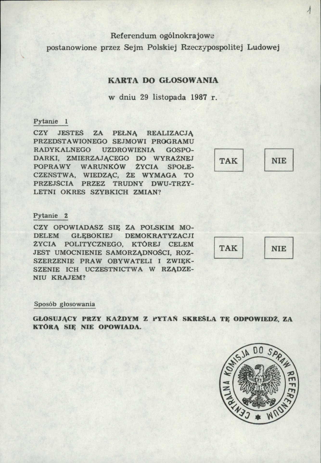 „1. Czy jesteś za pełną realizacją przedstawionego Sejmowi programu radykalnego uzdrowienia gospodarki, zmierzającego do wyraźnego poprawienia warunków życia, wiedząc, że wymaga to przejścia przez trudny dwu-trzyletni okres szybkich zmian?;