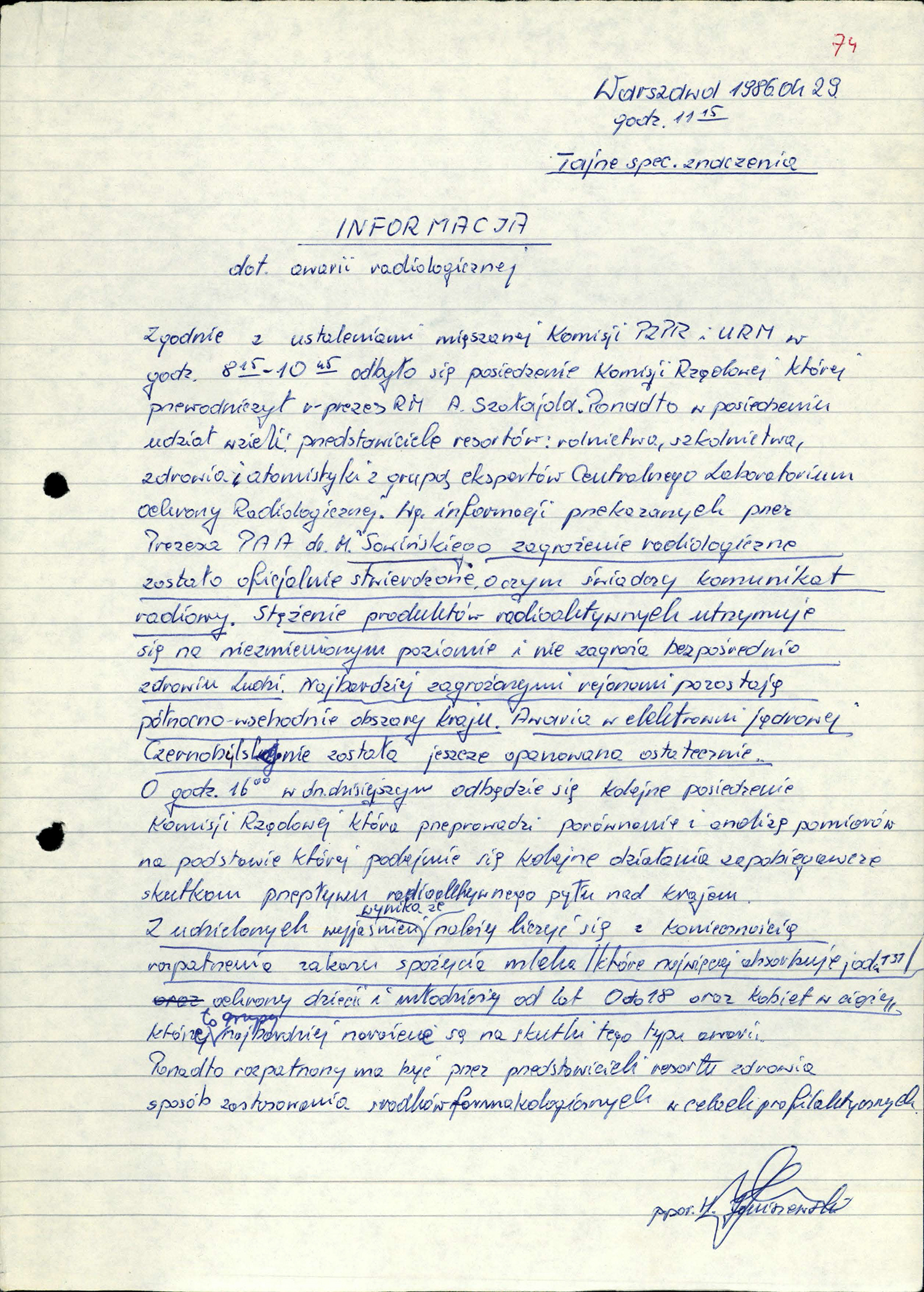 Pilny raport o awarii – kopia pochodzi z Biblioteki Kongresu USA, a oryginał jest w moskiewskim RGANI -