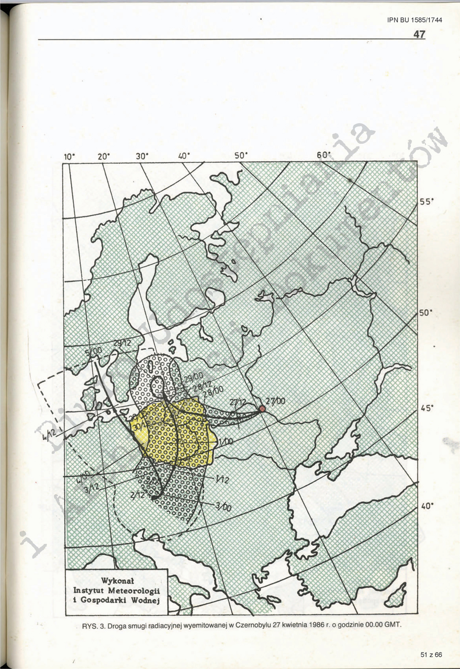 Mapa trajektorii chmury radioaktywnej z Raportu Komisji Rządowej