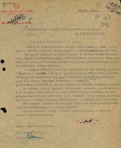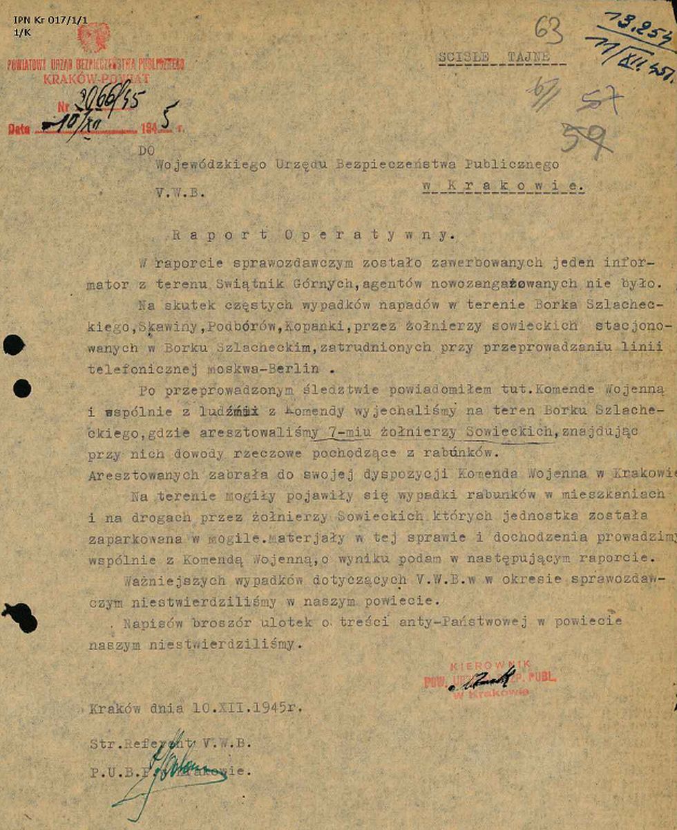 Z kolei szef PUBP w Krakowie raportował: „Na skutek częstych wypadków napadów w terenie Borka Szlacheckiego, Skawiny, Podoborów, Kopanki przez żołnierzy sowieckich stacjonujących w Borku Szlacheckim, zatrudnionych przy przeprowadzaniu linii telefonicznej Moskwa – Berlin” przeprowadzono śledztwo i zawiadomiono sowiecką Komendę Wojenną. Po czym „wspólnie z ludźmi z Komendy wyjechaliśmy na teren Borku Szlacheckiego, gdzie aresztowaliśmy 7 żołnierzy sowieckich, znajdując przy nich dowody rzeczowe pochodzące z rabunków”. Jednocześnie dodawał, że „na terenie Mogiły pojawiły się wypadki rabunków w mieszkaniach i na drogach przez żołnierzy sowieckich, których jednostka została zaparkowana w Mogile”. (IPN Kr 017/1, t. 1, Sprawozdania i raporty dekadowe Referatu III PUBP w Krakowie z lat 1945-1948 dotyczące zwalczania nielegalnych ugrupowań działających na terenie powiatu, k. 63, Raport operatywny, Kraków, 10 XII 1945 r.). W kolejnym raporcie pisanym trzy dni później czytamy „o dwóch napadach, do których doszło [w] Węgrzcach i Mogile. Bandytów było 4 do 6, uzbrojeni w karabiny i automaty, w mundurach wojska rosyjskiego”. (IPN Kr 017/1, t. 1, k. 64, Raport operatywny za czas od dnia 8 do 13 XII 1945, Kraków, 13 XII 1945 r.).