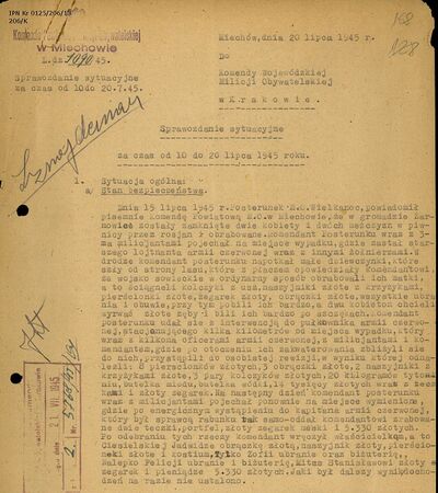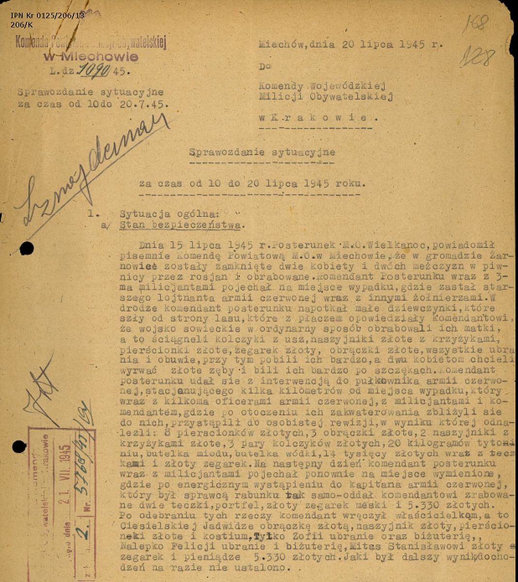 Jeden z brutalnych przypadków napadu przez żołnierzy Armii Czerwonej na polskich cywili opisuje komendant powiatowy MO z Miechowa, także w lipcu 1945 r. W sprawozdaniu na temat sytuacji w powiecie czytamy m.in.: „że w gromadzie Żarnowiec zostały zamknięte dwie kobiety i dwóch mężczyzn w piwnicy przez rosjan [sic!] i obrabowane. Jak opisywał, milicjanci z Miechowa, jadąc na miejsce zdarzenia, napotkali małe dziewczynki, które szły od strony lasu, które z płaczem opowiedziały […] że wojsko sowieckie w ordynarny sposób obrabowali ich matki, a to ściągnęli kolczyki z usz, naszyjniki złote z krzyżykami, pierścionki złote, zegarek złoty obrączki złote, wszystkie ubrania i obuwie, przy tym pobili ich bardzo, a dwu kobietom chcieli wyrwać złote zęby i bili ich bardzo po szczękach. Przy czerwonoarmistach znaleziono: 8 pierścionków złotych, 3 obrączki złote, 2 naszyjniki z krzyżykami złote, 3 pary kolczyków złotych, 20 kilogramów tytoniu, butelka miodu, butelka wódki, 14 tysięcy złotych wraz z teczkami i złoty zegarek”. (IPN Kr 0125/206, t. 13, k. 168, Sprawozdanie sytuacyjne KP MO w Miechowie za czas od 10 do 20 lipca 1945 r., Miechów, 20 VII 1945 r.).