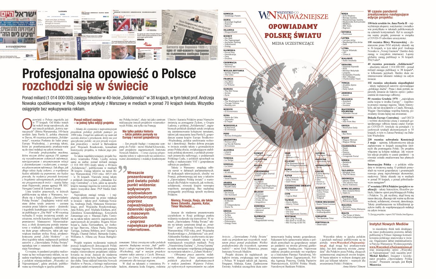 W „Rzeczpospolitej Plus Minus” z 18–19 września 2021 odnajdziemy podsumowanie projektu „Opowiadamy Polskę światu”, w ramach którego w dziennikach, tygodnikach i portalach internetowych na całym świecie ukazują się publikacje naukowców, historyków i polityków dotyczące historii Polski. Inicjatorem projektu jest Instytut Nowych Mediów, a partnerem Instytut Pamięci Narodowej.