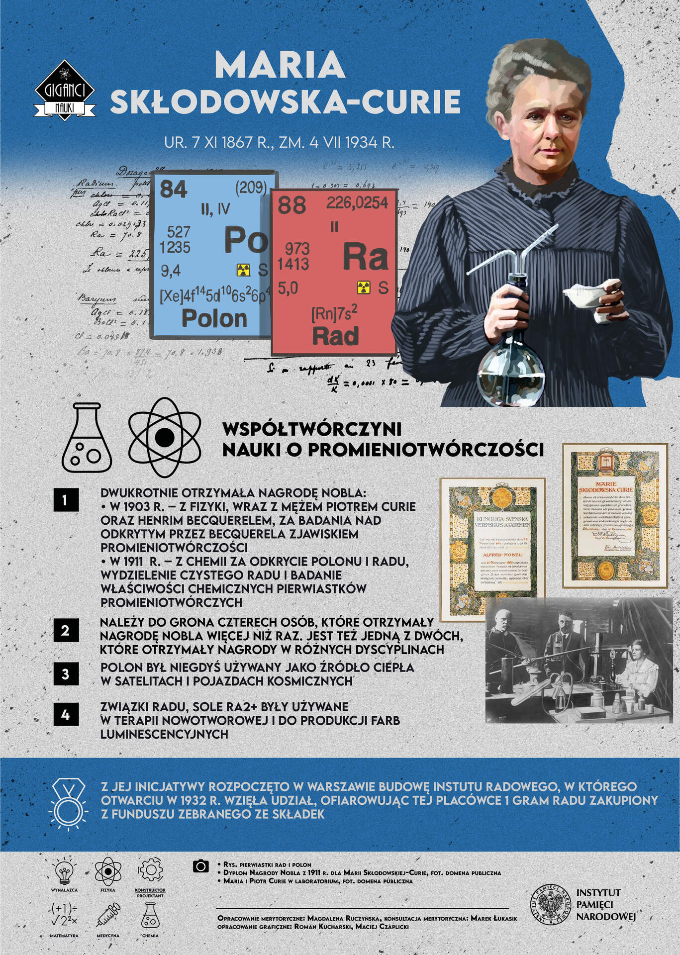 SKŁODOWSKA-CURIE Maria (7 XI 1867, Warszawa – 4 VII 1934, Sancellemoz, Francja), chemiczka i fizyczka, współtwórczyni nauki o promieniotwórczości. Była córką Władysława, nauczyciela fizyki i matematyki, oraz Bronisławy Boguskiej, przełożonej pensji dla dziewcząt.