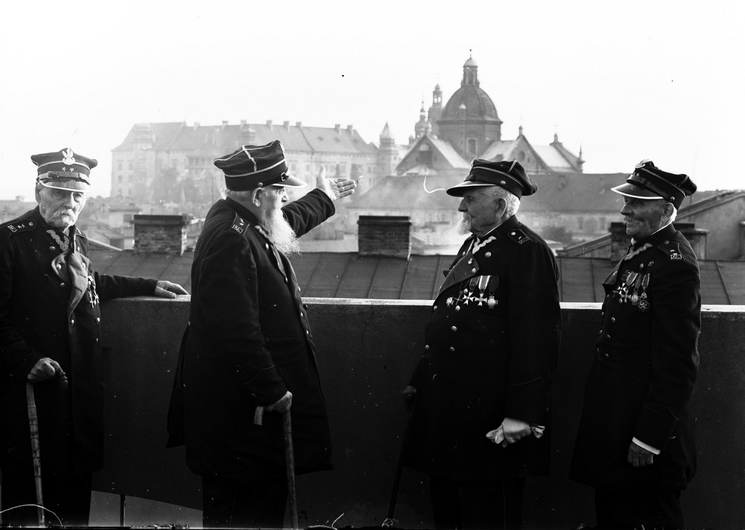 Kraków, weterani Powstania Styczniowego na dachu Pałacu Prasy; od lewej: Wiktor Malewski, Mamert Wandali, Antoni Suss i Walenty Milczarski. Uroczystości z okazji rocznicy wymarszu Pierwszej Kompanii Kadrowej, sierpień 1939. Do kolejnego sprawdzianu Polaków wierności Polsce pozostały tylko tygodnie... Ze zbiorów Narodowego Archiwum Cyfrowego