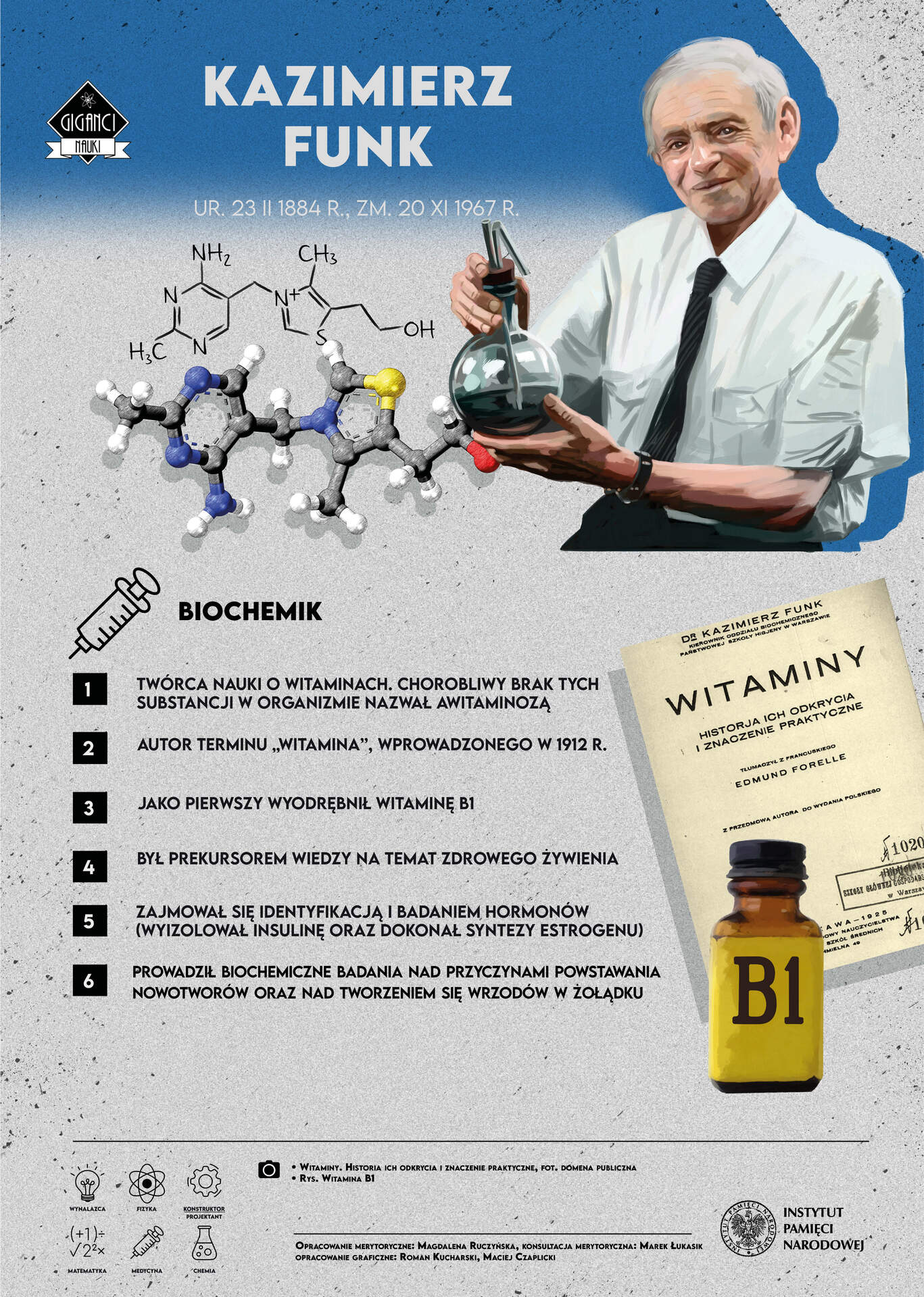 B. Giędosz: Kazimierz Funk i jego dzieło, odbitka z „Przeglądu Lekarskiego” 1949, nr 19; P. Griminter: Casimir Funk (1884–1967), „The Journal of Nutrition” 1972, Vol. 102, No. 9; B. Harrow: Casimir Funk – Pioneer in Vitamins and Hormones, New York 1955; J.P.: Kazimierz Funk (1884–1967), „Chemik” 2012, nr 1; „New York Times” z 21 XI 1967; „The Times” z 22 XI 1967.