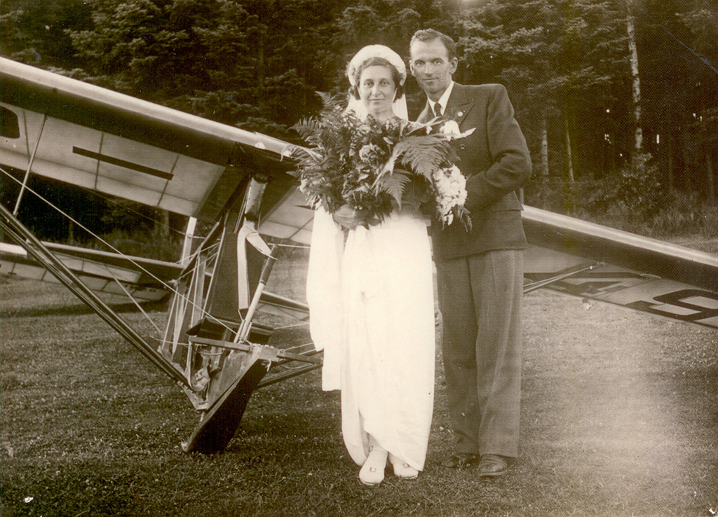 Janina i Mieczysław Lewandowscy po ślubie kościelnym w Tęgoborzu (pow. Nowy Sącz) 17 czerwca 1939 r. Zdjęcie wykonano na lotnisku w Tęgoborzu. Fot. w zbiorach Muzeum Powstańców Wielkopolskich im. Generała Józefa Dowbora Muśnickiego w Lusowie