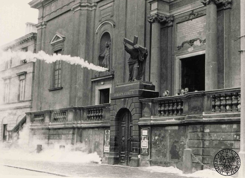 Marzec 1968 w Warszawie. Krakowskie Przedmieście, kościół św. Krzyża. Zdjęcie operacyjne SB. Fot. z zasobu IPN -