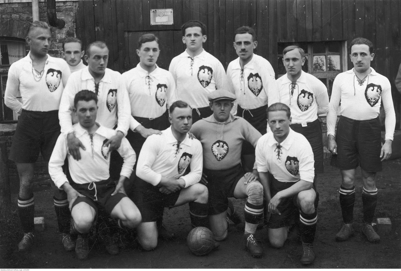 Piłkarski Puchar Europy Środkowej. Drużyna polska przed meczem z Węgrami. Stoją od lewej: Symplicjusz Zwierzewski, NN, Karol Pazurek, Aleksander Mysiak, Karol Kossok, Jan Wojciechowski, Józef Kałuża, Leon Sperling. Klęczą od lewej: Józef Mila, Henryk Martyna, Marian Fontowicz, Jerzy Bułanow. Poznań 1929 r. Fot. NAC