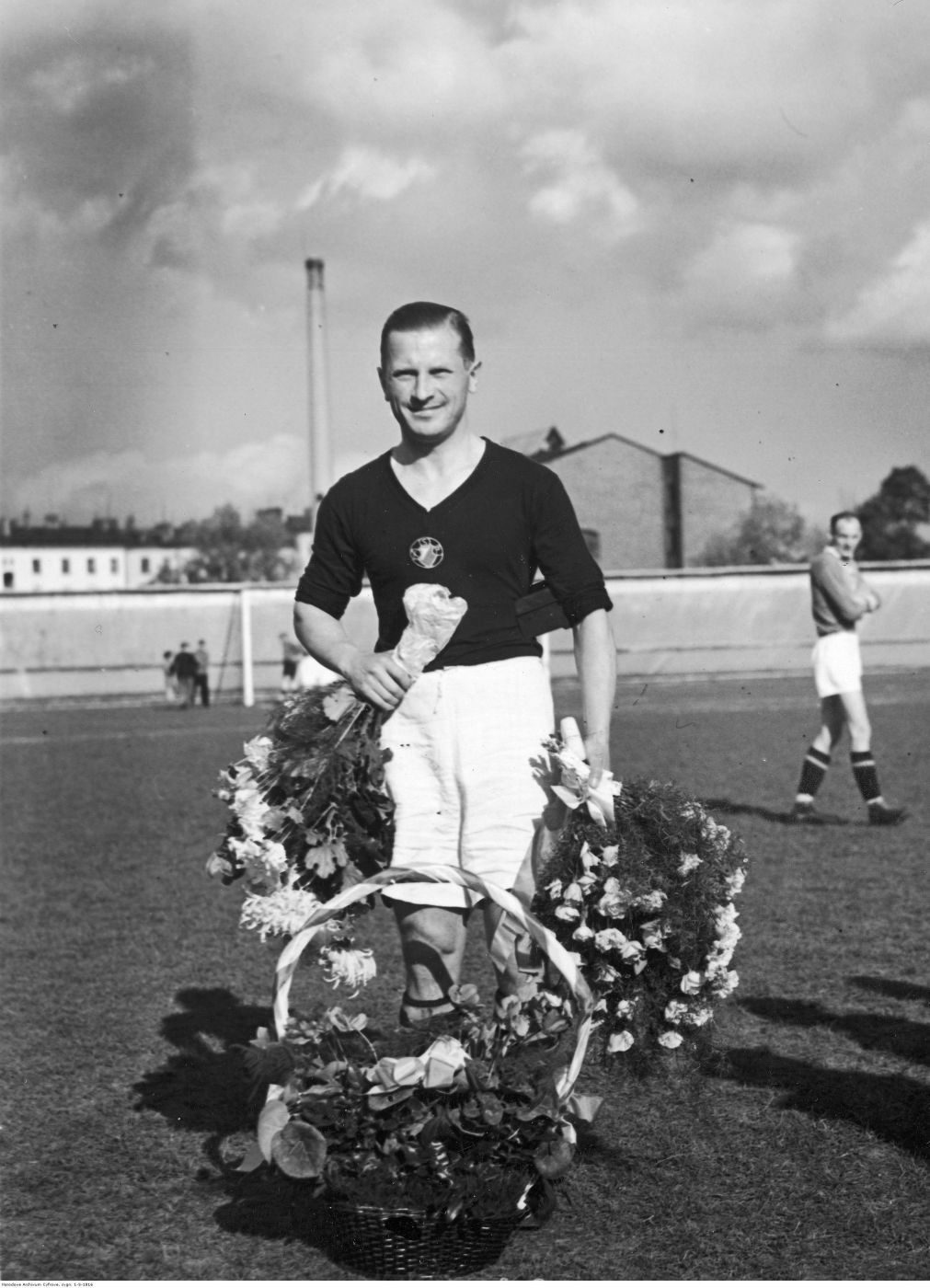 Piłkarz Jerzy Bułanow z kwiatami otrzymanymi z okazji rozegranego 400 meczu w barwach klubu sportowego Polonia Warszawa. Warszawa 1935. Fot. NAC