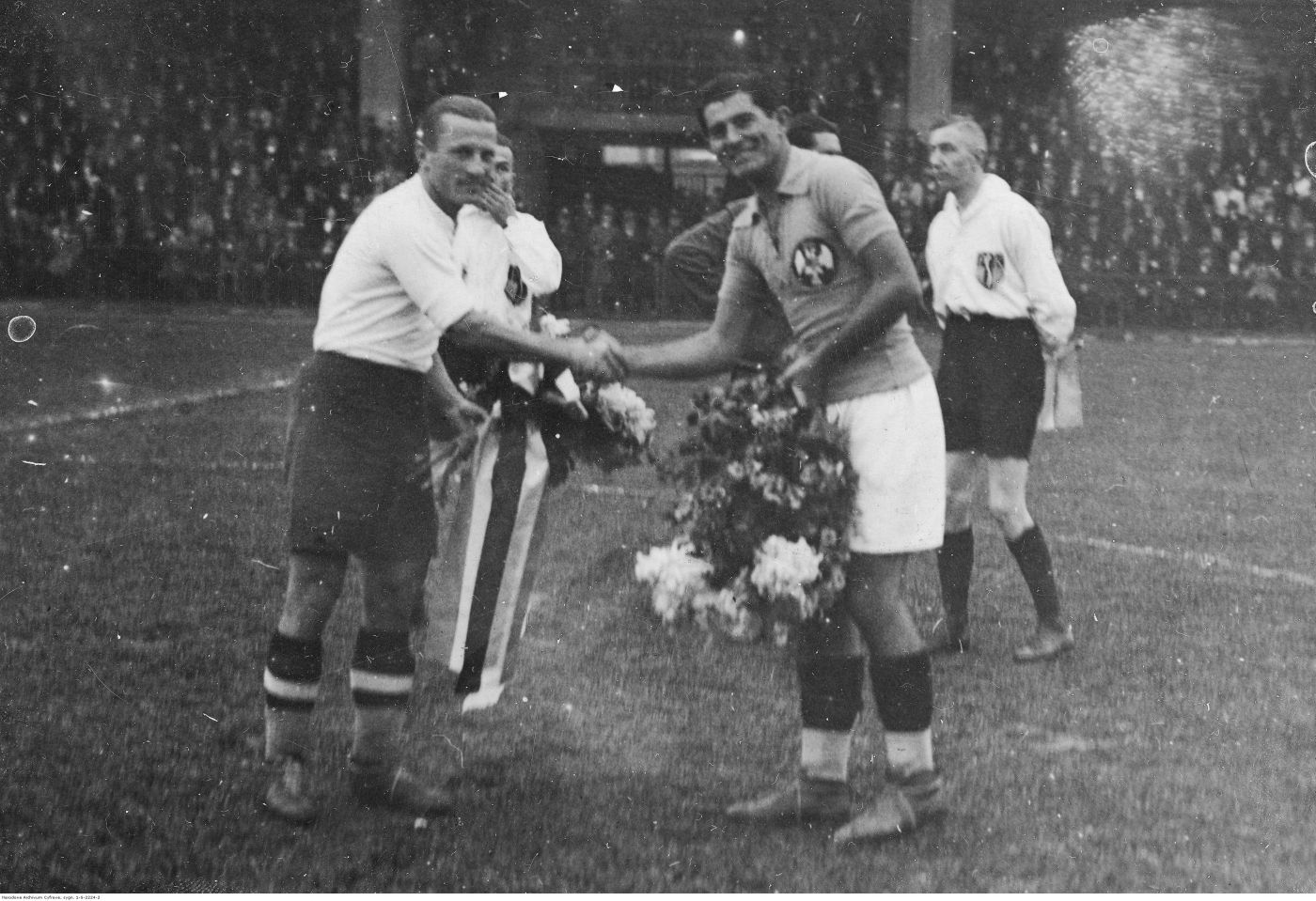 Kapitanowie drużyn Jerzy Bułanow (z lewej) i Milutin Ivković (z prawej) wręczają sobie wiązanki kwiatów przed meczem. 1931 r. Fot. NAC