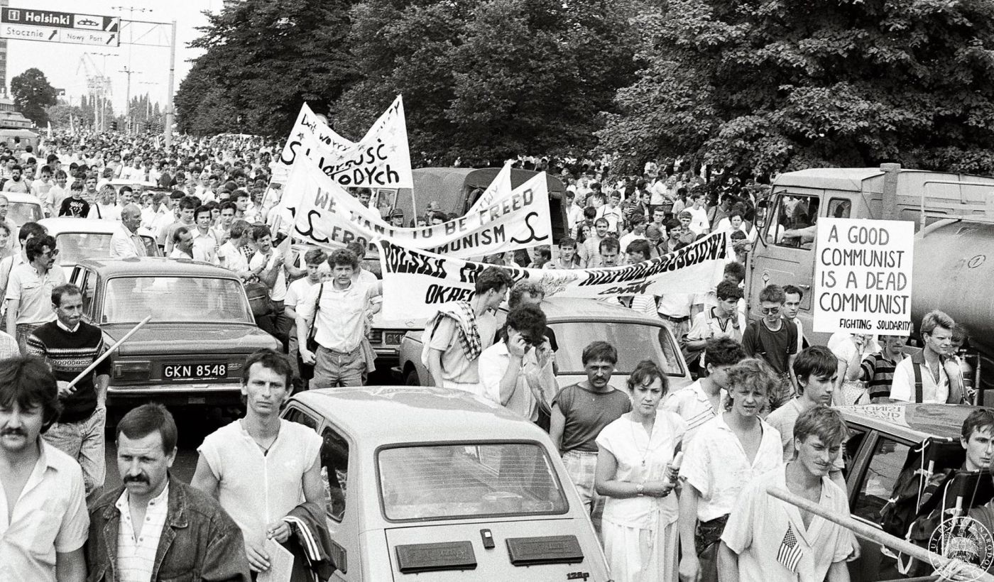 Demonstracja antykomunistyczna Solidarności Walczącej w czasie wizyty prezydenta USA George'a Busha w Gdańsku. Demonstracji w okolicy ulicy Podwale Grodzkie, w głębi fragment wieżowca zwanym "Zieleniakiem". Fot. Stanisław Składanowski. 11 lipca 1989 r. (fotografia ze zbiorów IPN, sygn. IPNBU-3-11-7-185)
