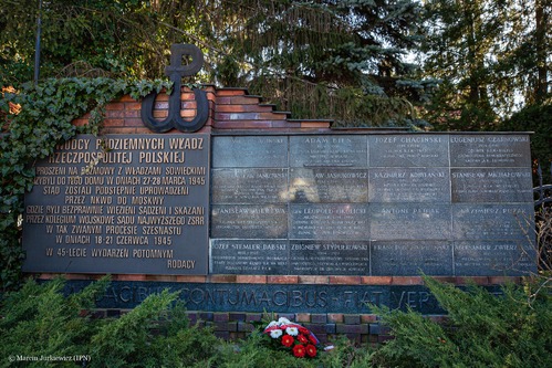 Pomnik w Pruszkowie z tablicami upamiętniającymi szesnastu przywódców Polskiego Państwa Podziemnego, uprowadzonych w 1945 roku przez władze ZSRS. Fot. Marcin Jurkiewicz (IPN)