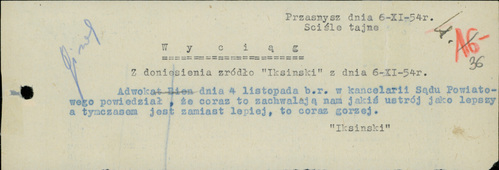 Wyciąg z doniesienia agenturalnego dotyczącego Adama Bienia, 6 listopada 1954 r. Z zasobu AIPN