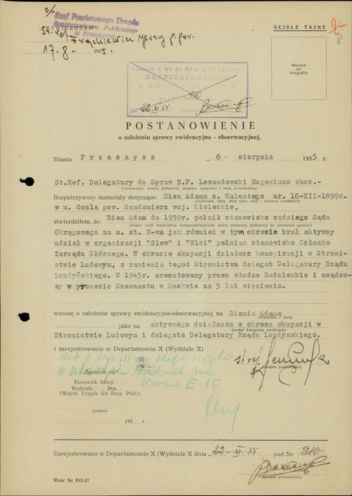 Postanowienie o założeniu sprawy ewidencyjno-obserwacyjnej „na Bienia Adama jako na aktywnego działacza z okresu okupacji w Stronnictwie Ludowym i delegata Delegatury Rządu Londyńskiego”. Przasnysz, 6 sierpnia 1955 r.