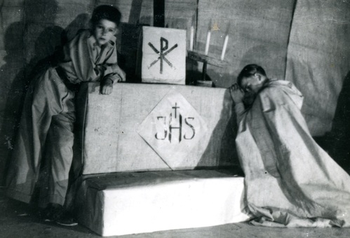 Inscenizacja „Kordiana” w wykonaniu zespołu młodzieżowego. Na zdjęciu widoczni odtwórcy głównych ról: Marian Różański, Bohdan Czaykowski, Osiedle Dzieci Polskich w Balachadi, 1945 r. Fot. z zasobu AIPN -