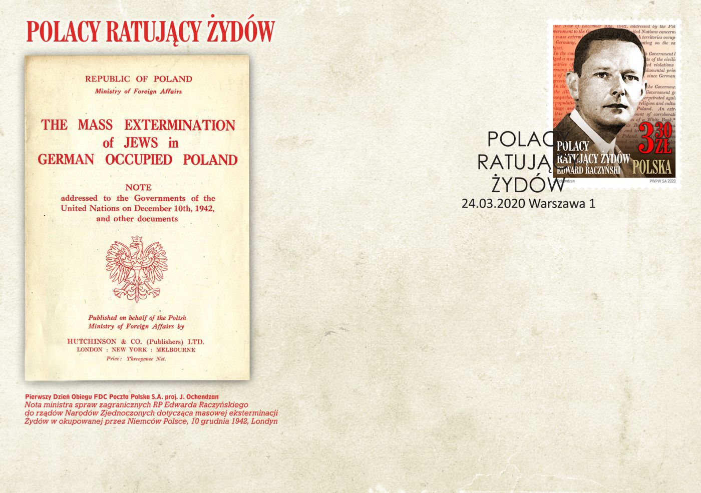 Na kopercie FDC przedstawiono pierwszą stronę „Noty Raczyńskiego do rządów Narodów Zjednoczonych" z dnia 10 grudnia 1942 r., która dotyczy masowej eksterminacji Żydów w okupowanej przez Niemców Polsce.